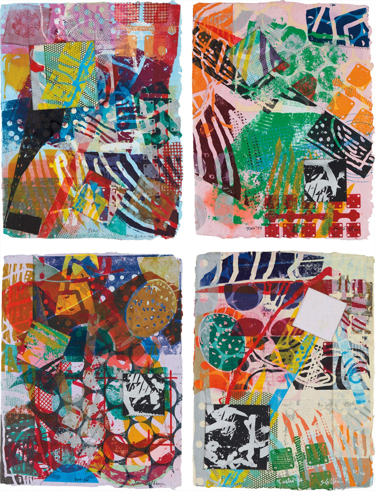 Four monoprints with screenprint, collage, acrylic, stitching and embossing in colors, on handmade paper, the full sheets.