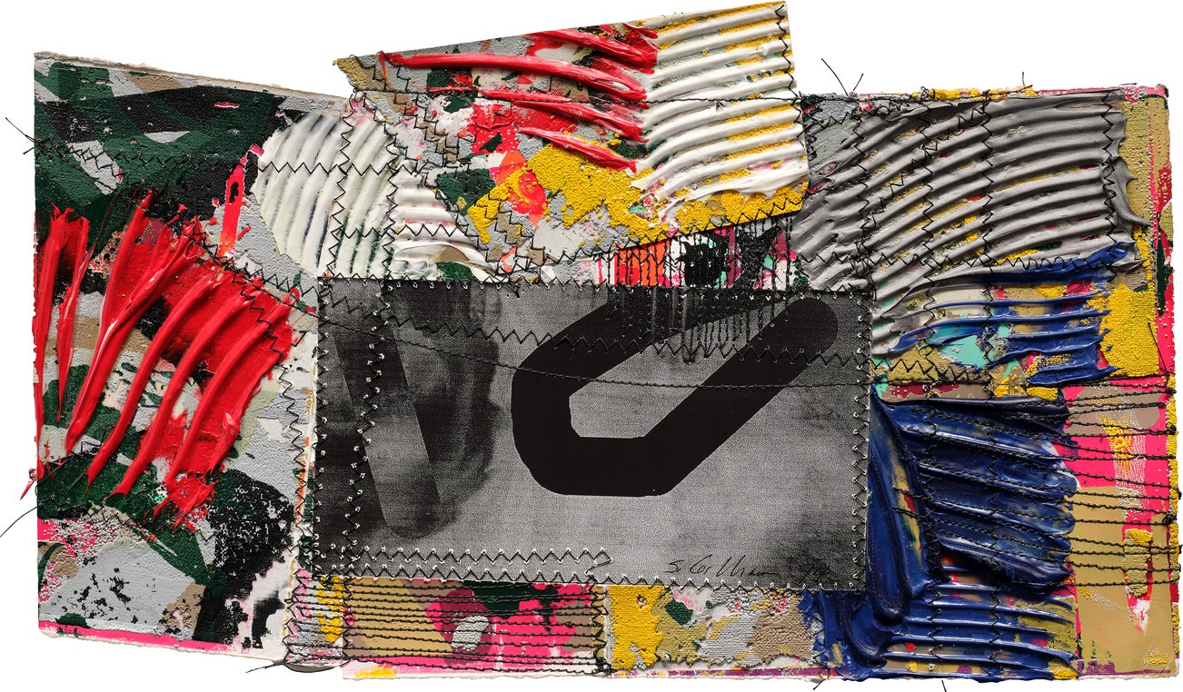 raked polypropylene, acrylic and monoprint on collaged and sewn fabric and paper