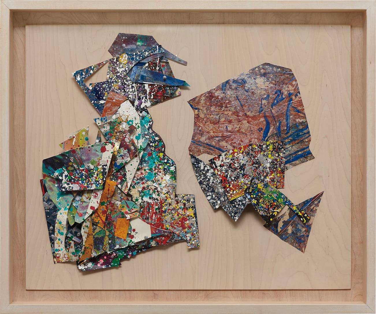 polypropylene, acrylic and monoprint on an assemblage of collaged paper, with aluminum fasteners on wood panel, in artist's frame