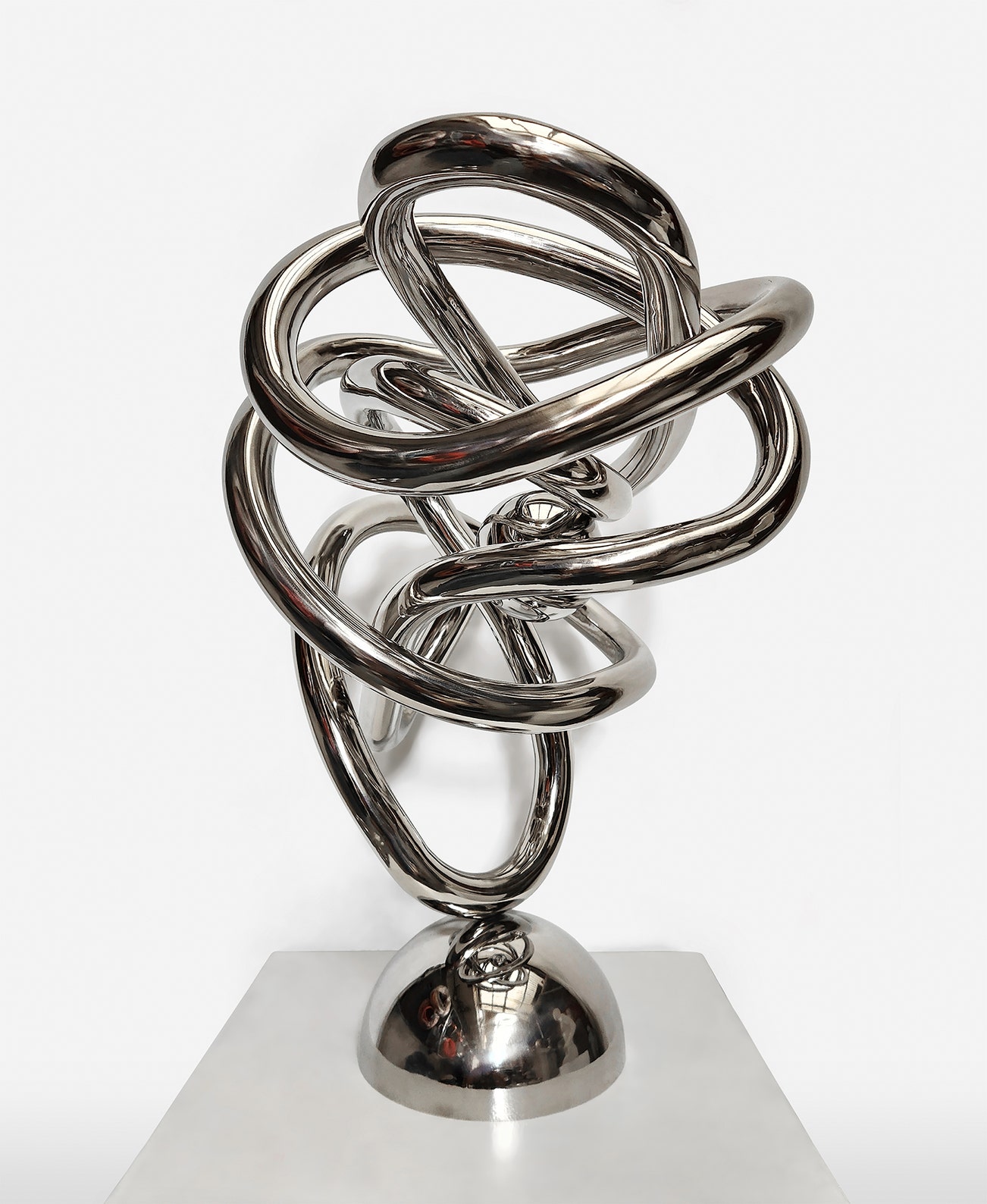 In Dragonball, Sam Penaso uses the solid medium of stainless steel to paradoxically capture a flurry of flight. The central knot forms a sphere of power, which the sculpture tracks as it twists and turns dynamically through space. The reflective quality of the steel adds to the sense of movement created in the sculpture as surrounding activities are captured on its surface.