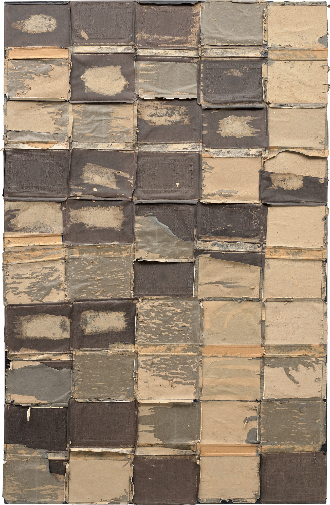 deconstructed encyclopedia covers, thread and acrylic laid down on canvas