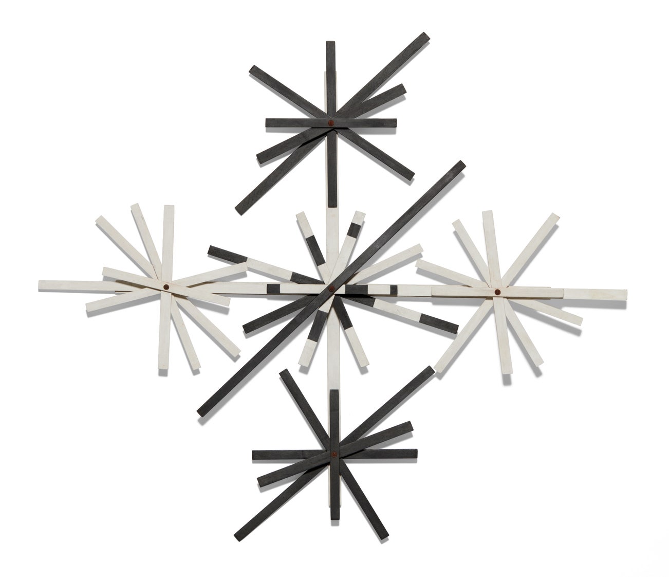 The present lot, with its mechanical construction and moving parts, is a masterful example of Darié’s novel style. As aptly elucidated by Abigail McEwen, Darié “challenges the fixity of line and color, directing their movement dynamically beyond the frame, implicitly displacing art into life” (Abigail McEwen, Concrete Cuba – Cuban Geometric Abastraction from the 1950s, New York, 2015, p. 7). Imbued with a geometric rigor reminiscent of Piet Mondrian’s Neoplasticism, this elegant work compels viewers to engage with its movable components to create various star bursts of black and white. Untitled (from the series ‘Formas geométricas móviles') is a masterwork that definitively denotes the pioneering theoretical scope of Cuban Concretism.