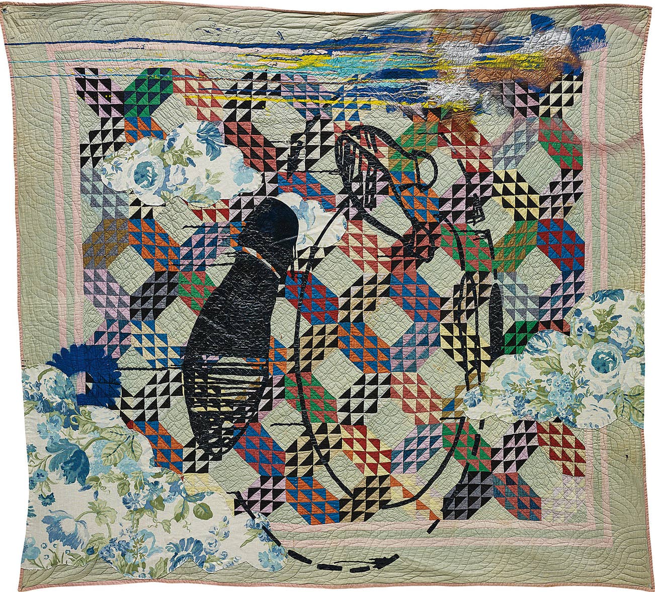 fabric collage, treated acrylic, metallic acrylic and glitter on re-purposed quilt
