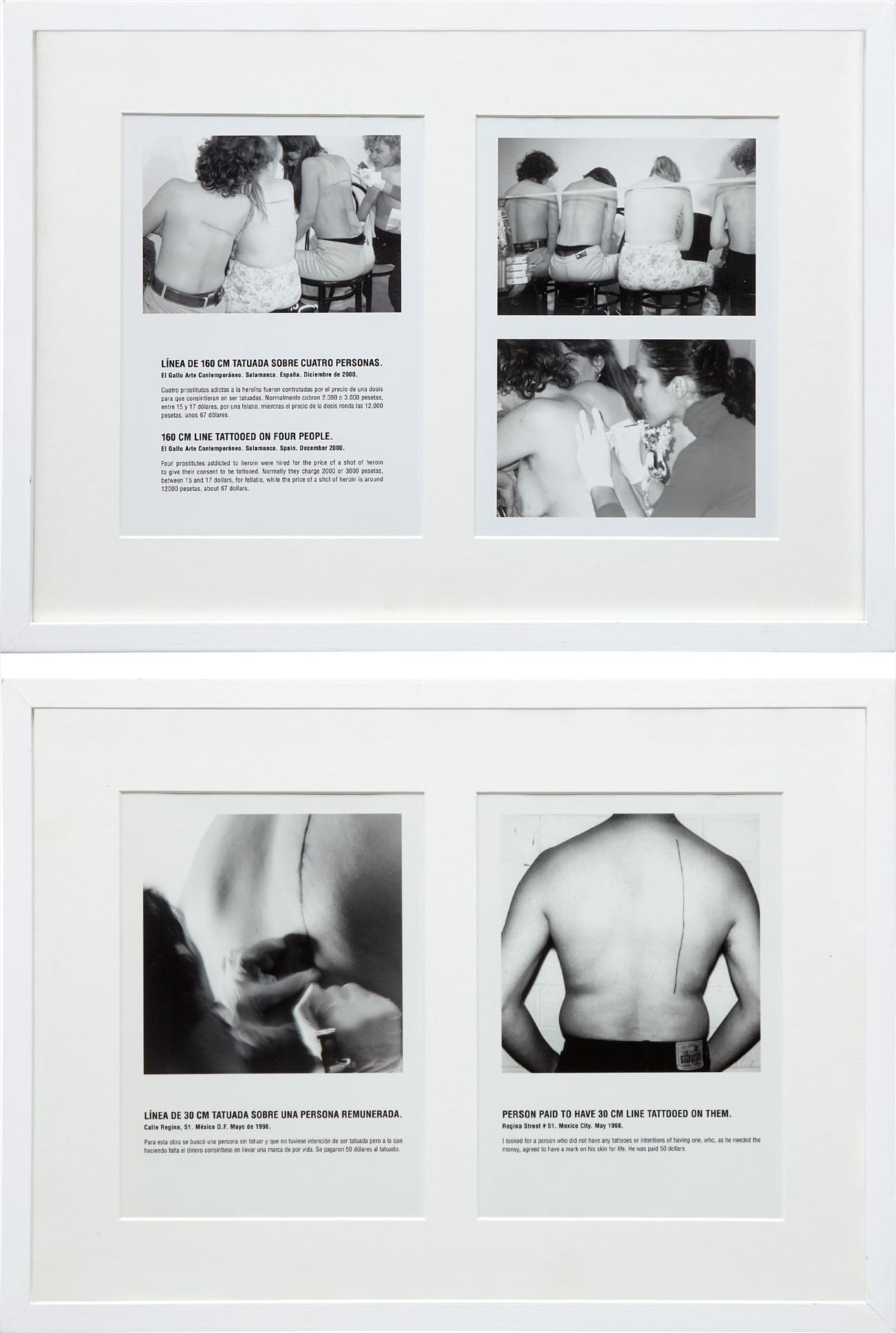 Two works: i) 160 cm Line Tattooed on 4 People El Gallo Arte Contemporaneo. Salamanca, Spain. December 2000 (Línea de 160 cm tatuada sobre 4 personas El Gallo Arte Contemporáneo. Salamanca, España. Diciembre de 2000) ii) Line of 30 cm Tattooed on a Remunerated Person # 51 Regina Street. Mexico City, Mexico. May 1998 (Línea de 30 cm Tatuada Sobre un Persona Remunerada Calle Regina, # 51. México D.F., México. Mayo de 1998)