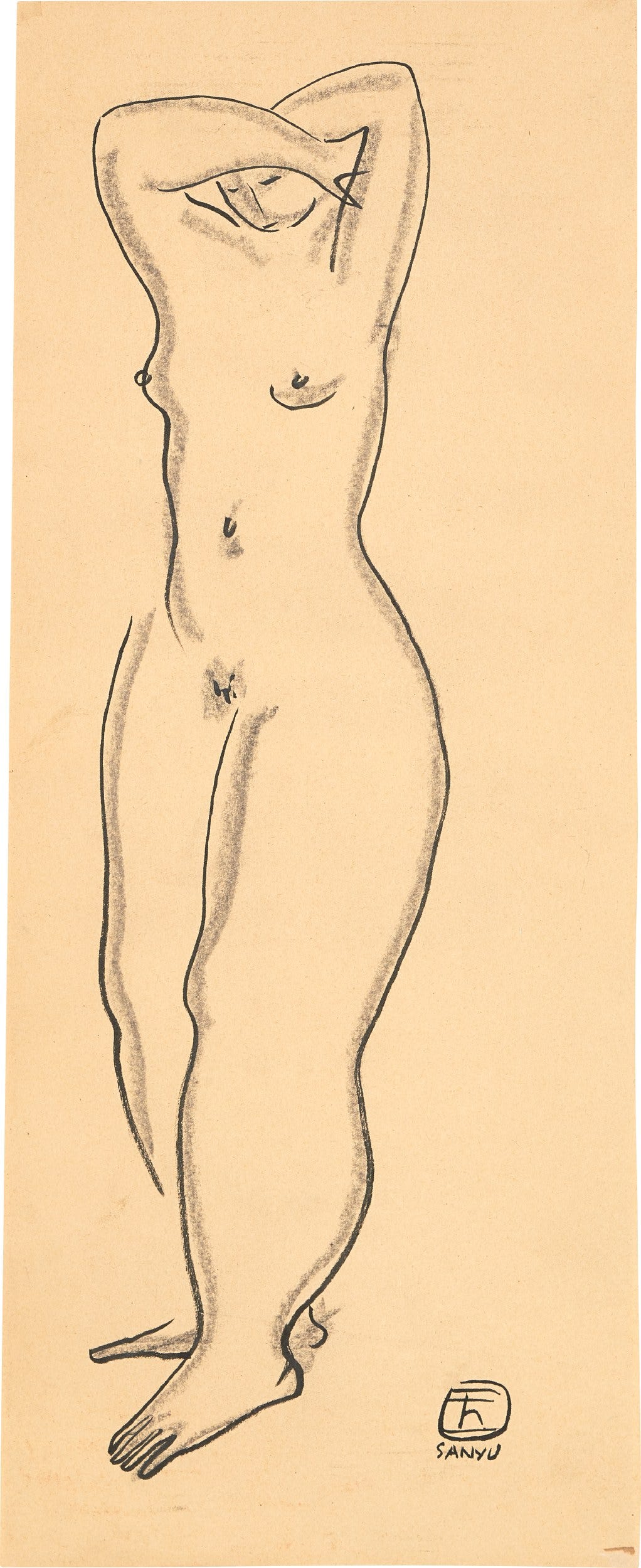 Having had years of rigorous practice in traditional Chinese calligraphy since a young age, Sanyu brilliantly incorporates the ink-wash technique into his nude drawings, evoking the beauty of the flesh. Moving away from the traditions of Western sketching through the use of charcoal and pen, Sanyu instead uses the rhythm of the calligraphy brush to create vividly subversive lines of the flesh, not only showing his ability to create flow and resilience in movement, but also demonstrating the simple yet exquisite qualities of Chinese ink painting.