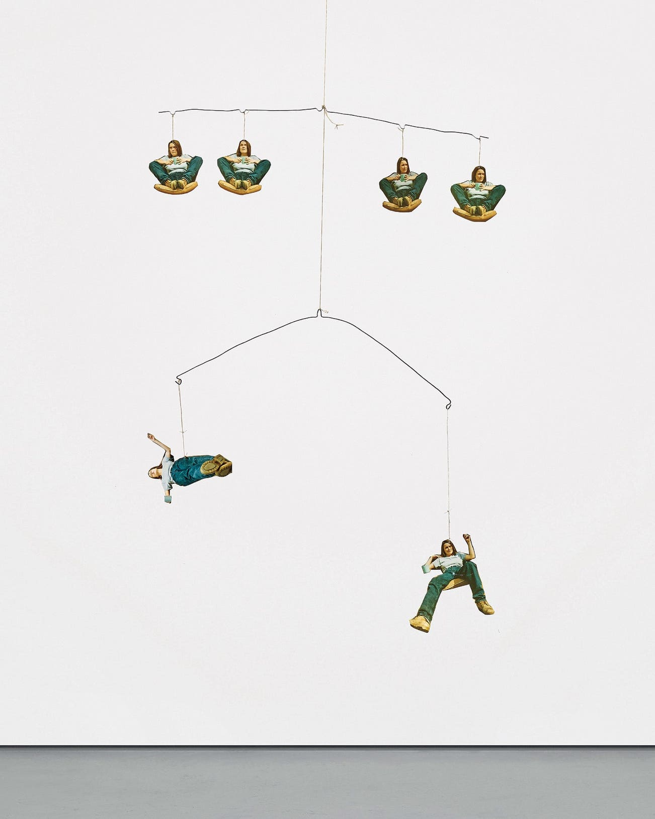 six cut out photographs, string and metal