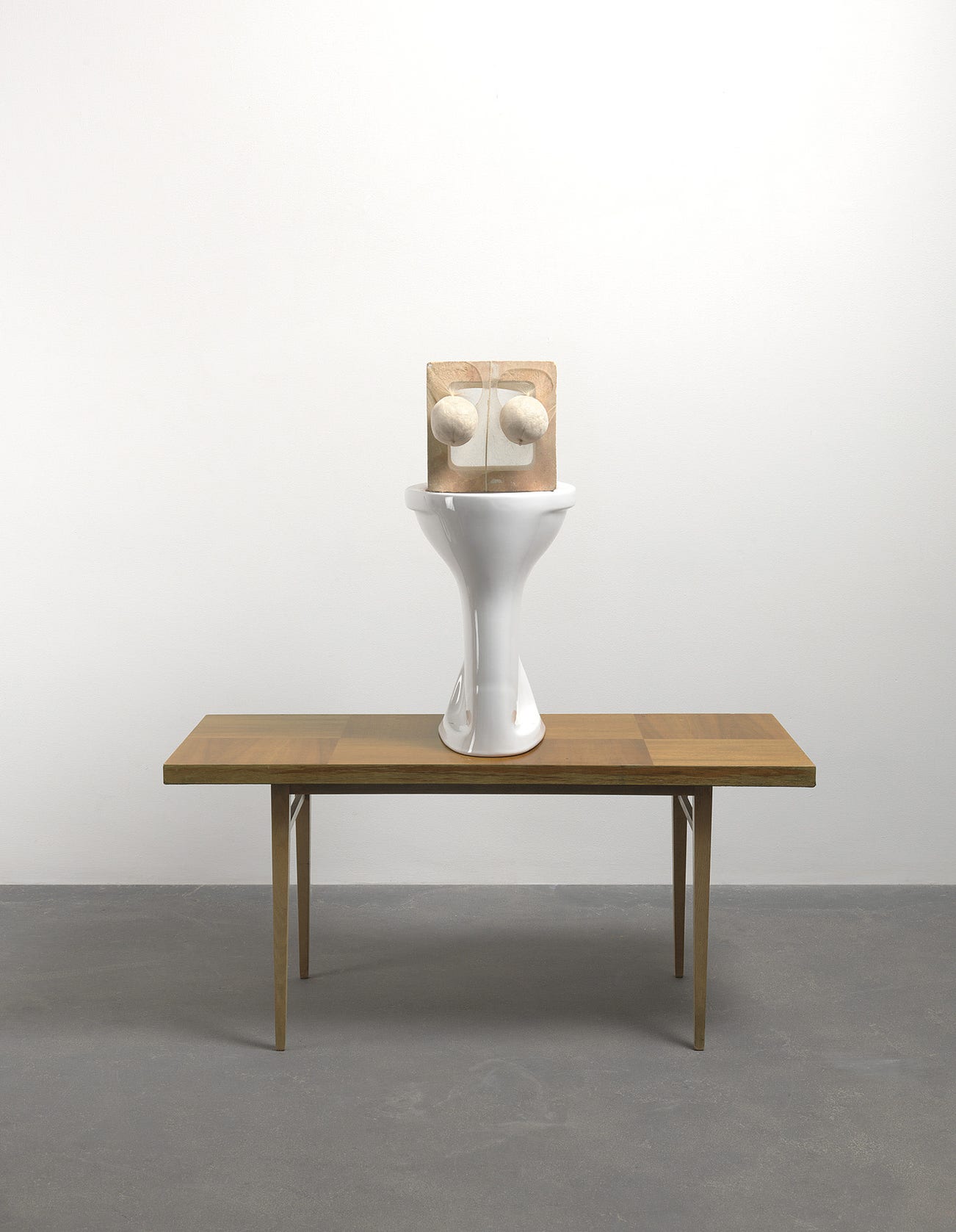 In Toilet Elevation, the anthropomorphic sculpture is a rudimentary representation of a headless female figure constructed out of quotidian objects. Reminiscent of Lucas’ infamous Bunny works of 1997, Toilet Elevation incorporates stuffed stockings stretched around a concrete block to form a headless corporeal structure. Each Bunny, modelled to represent the torso and legs of the female body, is affixed to a chair, whereas in the present work, the suggested female torso is placed onto a toilet bowl atop an altar-like table. A latrine forms the 'waist' of the figure while the simple Modernist table implies squarely-planted legs, with the breast-like forms of the stuffed tights culminating the stack of readymade parts. Elevating the importance of the toilet, and equating it to the human form, Lucas exposes the vulnerability and physicality of the human body. Praising the utilitarian object, Lucas has remarked: ‘Toilets are unsung heroes of our hygienic lives. Why don’t we celebrate them? It’s fascinating that the water goes round and round the system, gets cleaned and comes back round. There are contraceptives in the water so women get infertile... quite shocking things. We live with a level of impurity. It’s one thing I like about not bothering to make anything perfectly. It’s partly making things easy for myself but if you don’t live with imperfections you get stuck on one thing. Nothing is pure. Everything you do doesn’t go away. Some trace is there’ (Sarah Lucas, quoted in ‘Close Encounters of the Art Kind’, Victoria and Albert Museum, 2001, online).