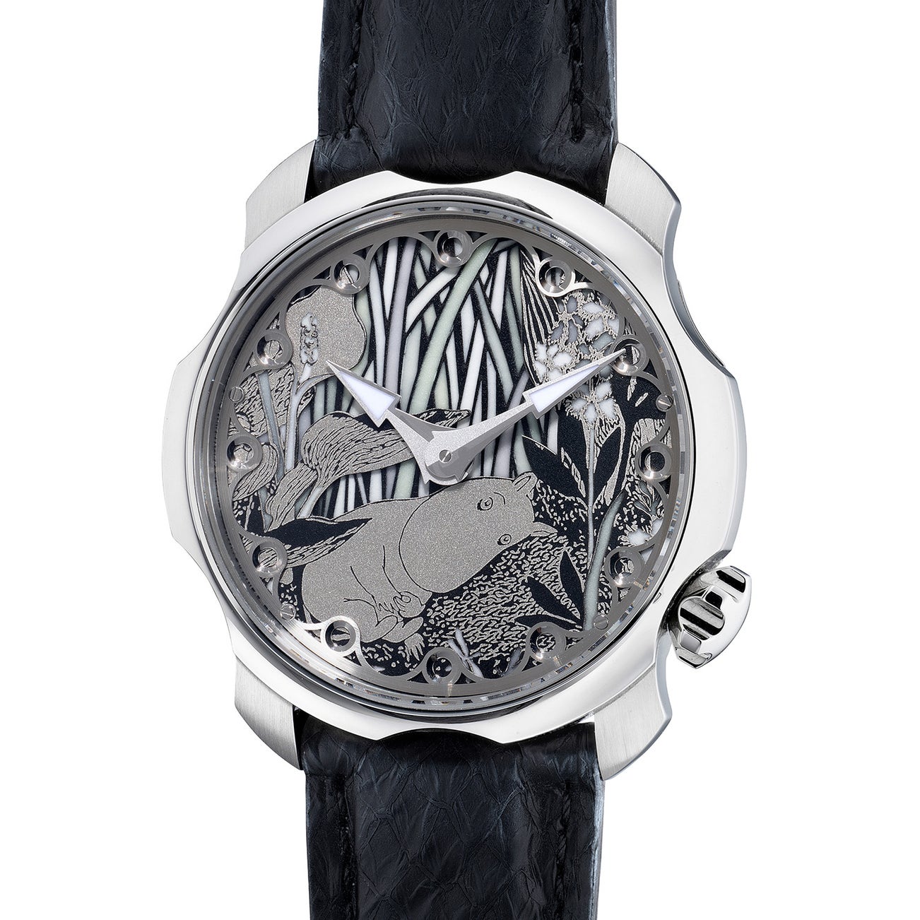 In 2020, S.U.F Sarpaneva Helsinki celebrates the 75th anniversary of the popular Finnish comic Moomin illustrated by illustrator Tove Jansson. The collaboration was produced in a total of 75 pieces made in three variants in either blue, steel or gold hands. Inspired by the original black and white illustration by Jansson, Sarpaneva injected his inventiveness and technical finesse to the fairytale of Moominvalley. The timepiece paid more than just a homage to the cartoon but surely a statement to the industry of implementing Super-Luminova as a form of art instead of applying it to tell time in the dark.