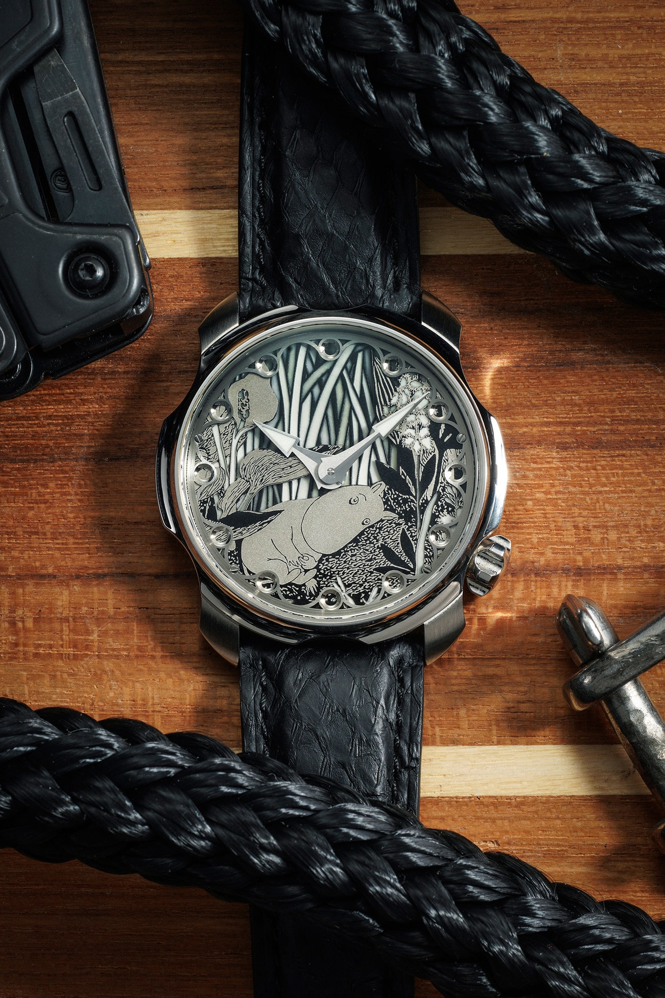 - Drawing inspiration from Jansson's original black and white illustration, Sarpaneva infused his creativity and technical expertise into the Moominvalley fairytale. The watch goes above and beyond the simple paying homage to the cartoon; it serves as a statement within the industry, showcasing the use of Super-Luminova not just as a functional feature for telling time in the dark but as a form of artistic expression as the dial magically lights up showcasing vibrant colors in the dark (or under UV light).