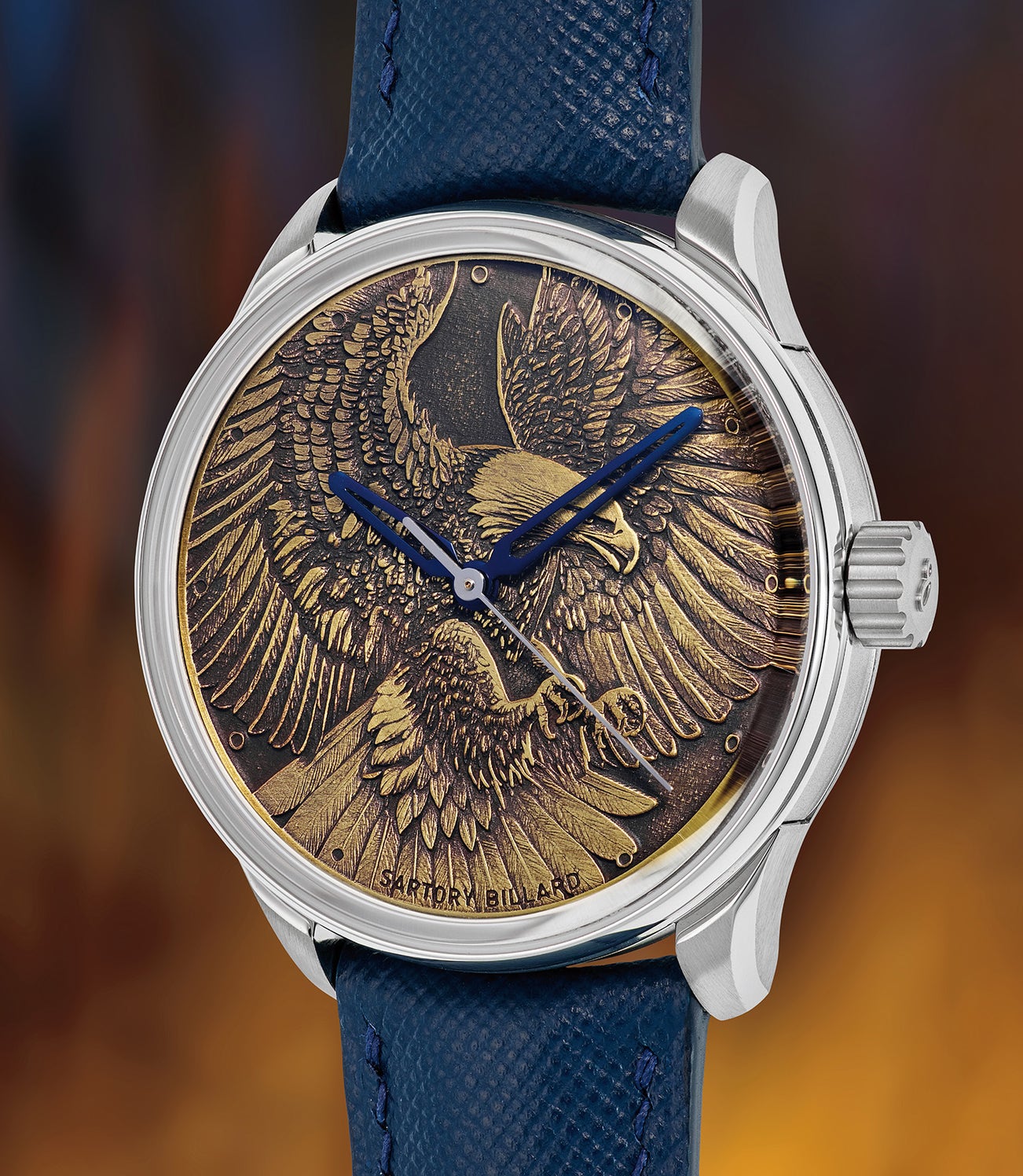 The dial is made from American-sourced brass, which is significant for a brand that places a strong emphasis on the use of high-quality materials. Brass is favored not only for its American origin for this project and its durability but also for its ability to take on intricate engravings, making it an ideal canvas for the elaborate eagle design seen on the SB04.