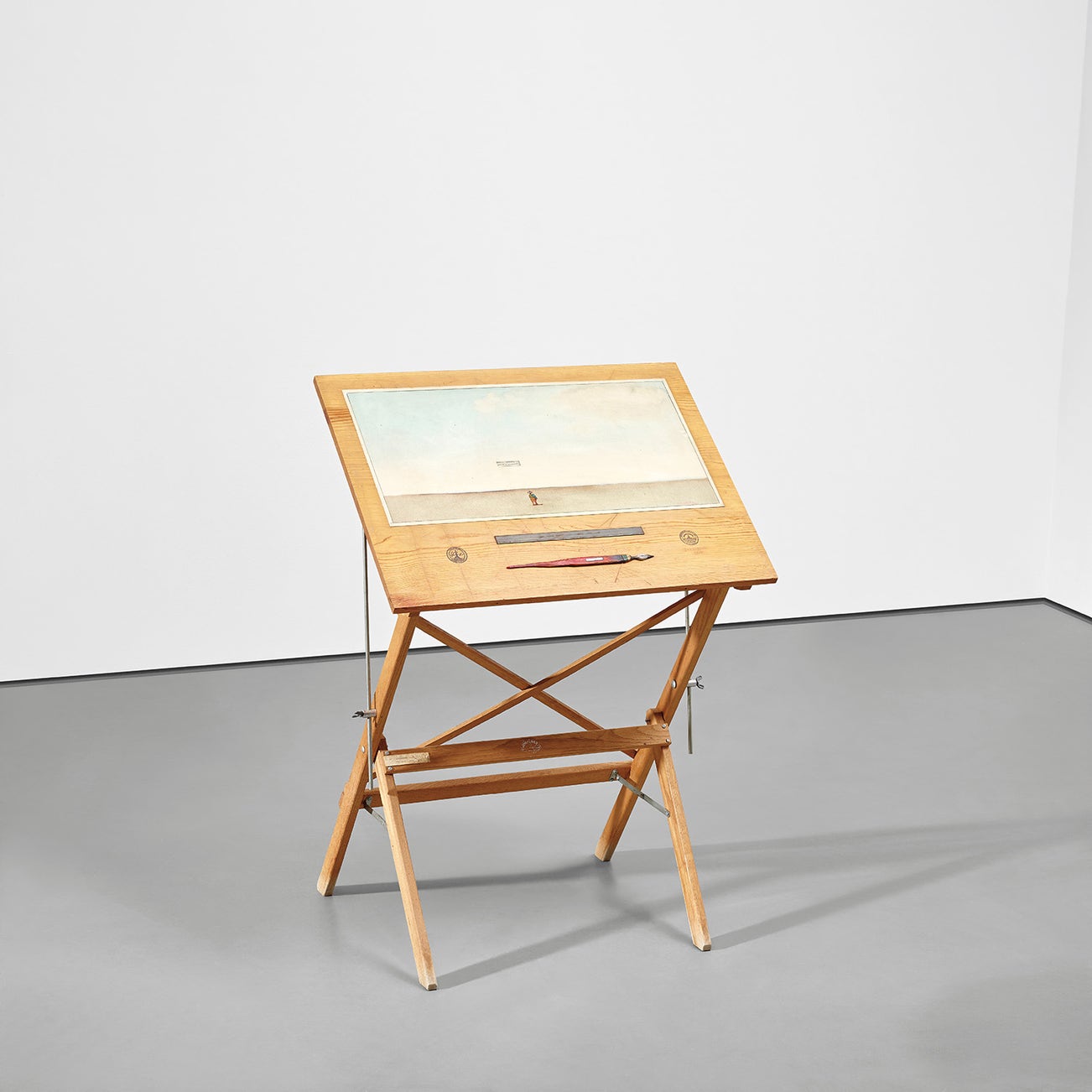 wood drafting table, steel and wood collage and oil, watercolor and pencil on paper