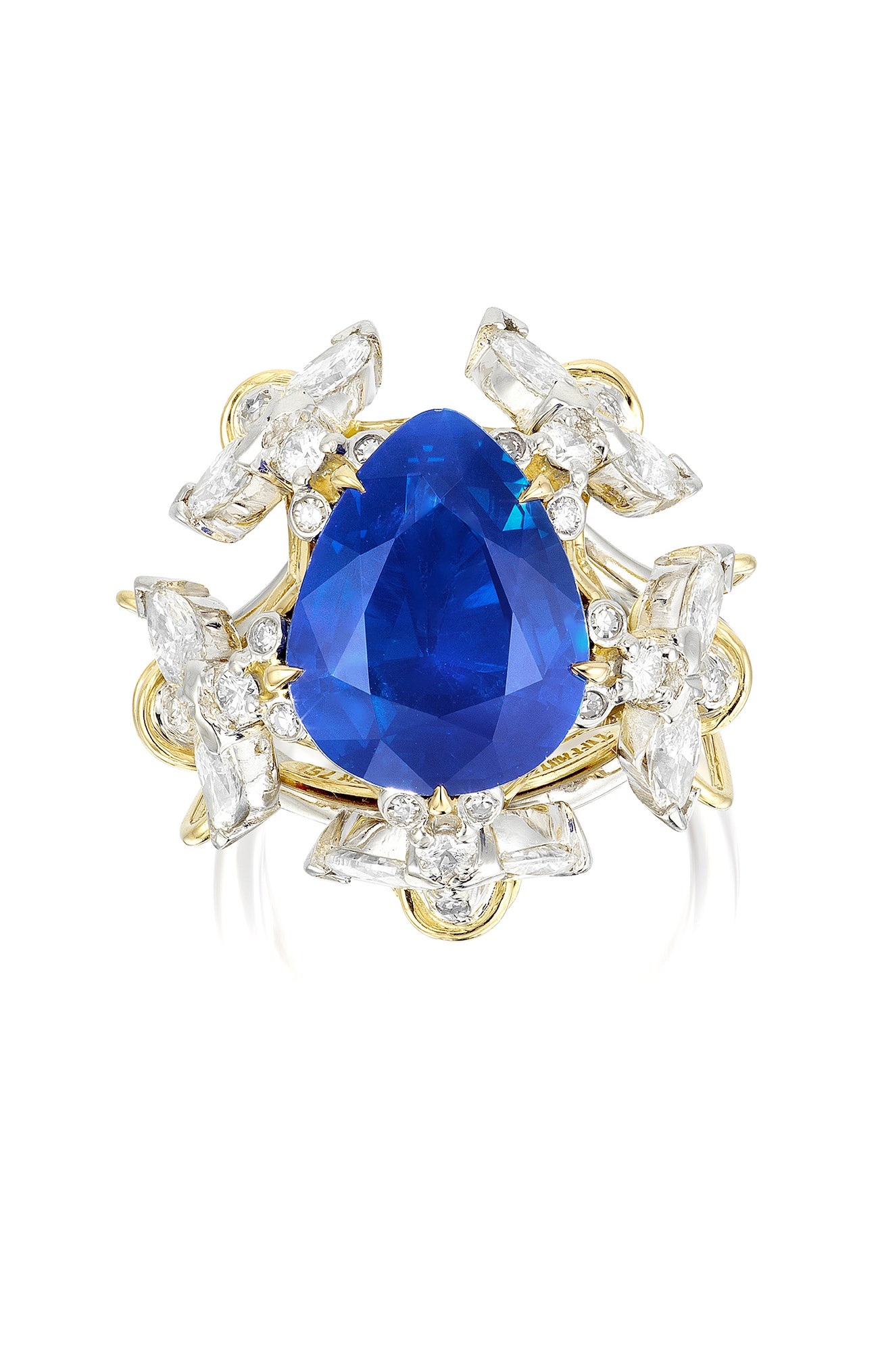 Set with a pear-shaped sapphire weighing approximately 6.26 carats, framed by bee motifs set with marquise-shaped and brilliant-cut diamonds, mounted in yellow gold and platinum, signed Tiffany Schlumberger, size 5½.