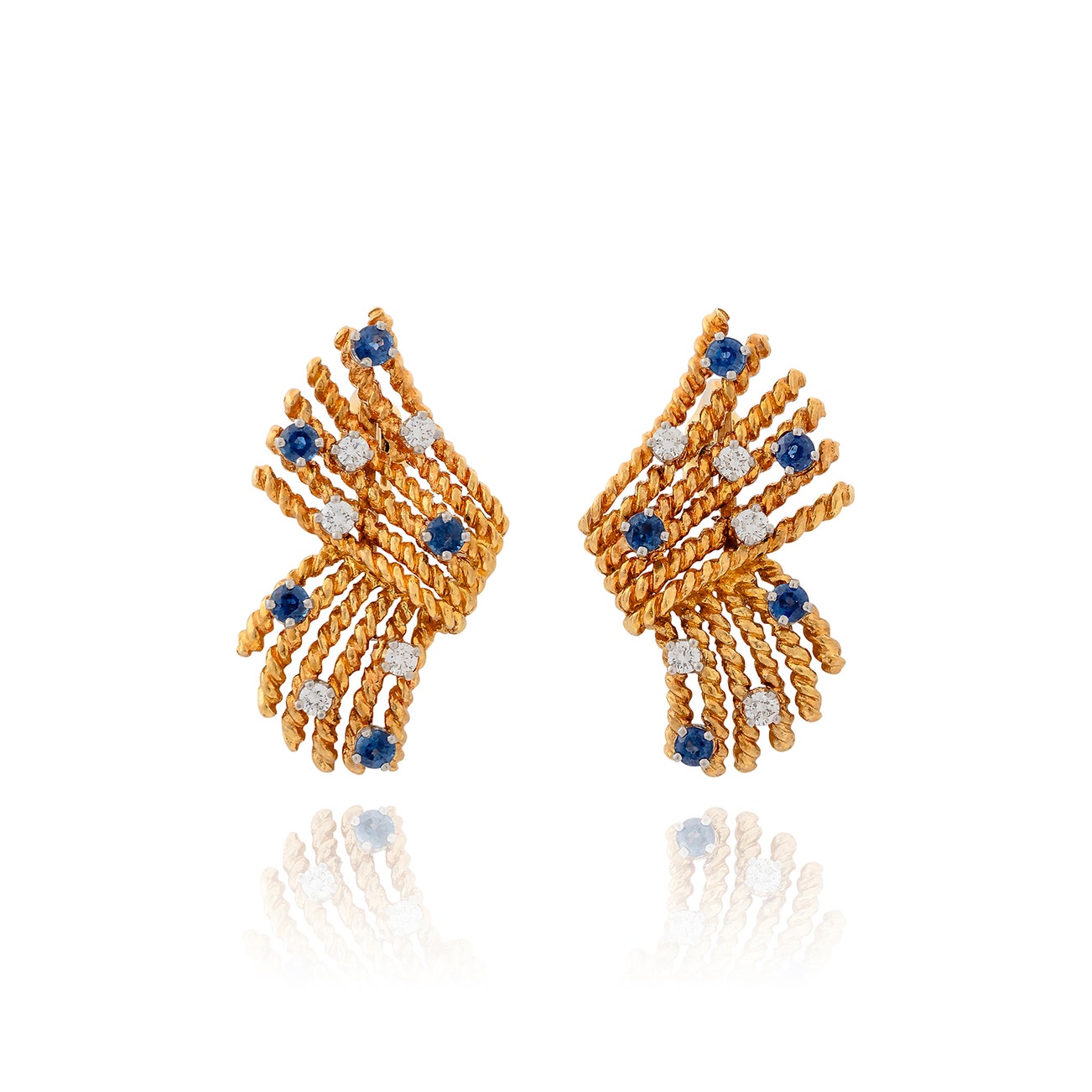 The gold rope motifs each set with circular-cut sapphires and brilliant-cut diamonds, measuring approximately 32 x 27mm, each signed Schlumberger for Tiffany & Co., case stamped Tiffany & Co.