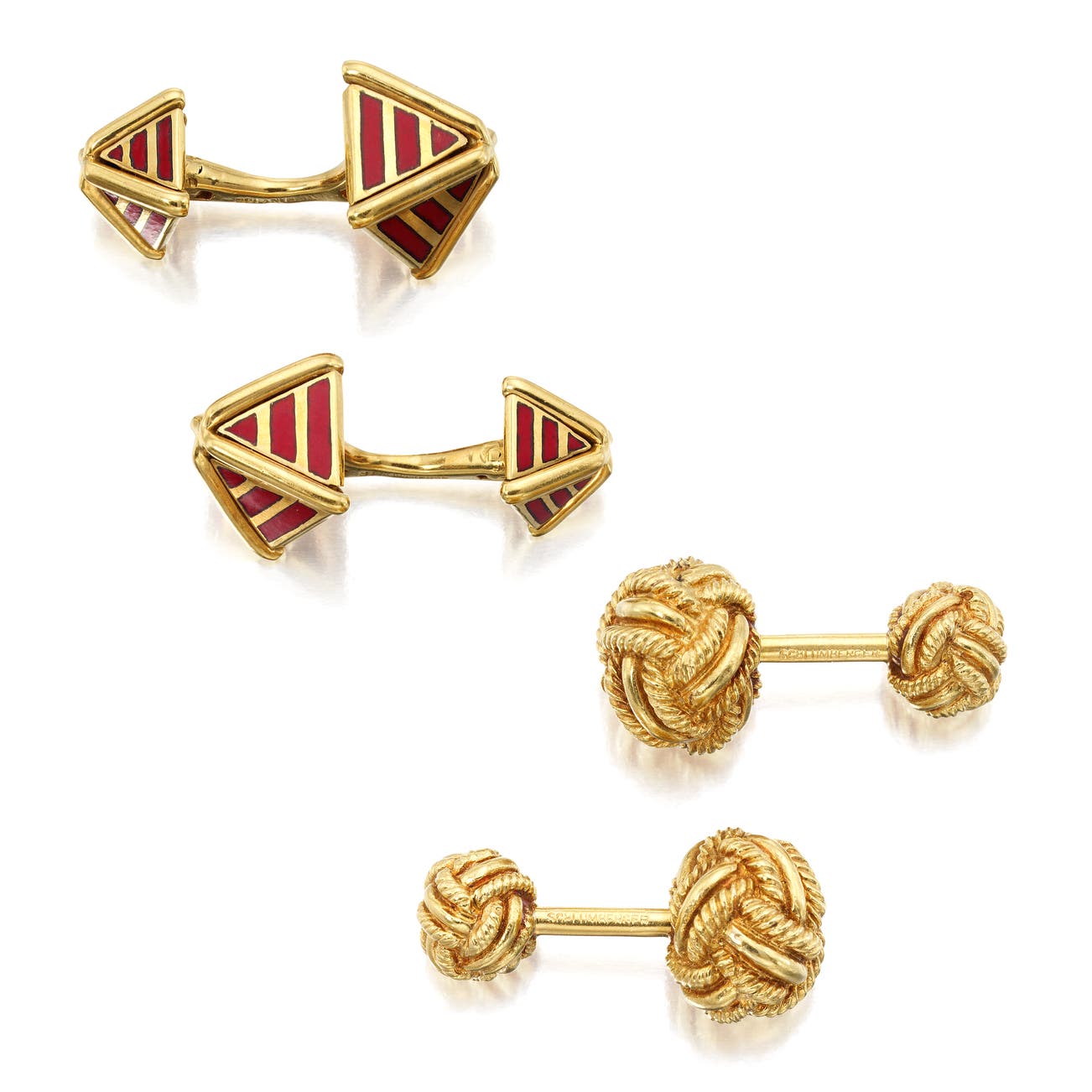 One pair with red enamel and one pair of woven design, each in 18k yellow gold, measuring approximately 1 inch each, each signed Tiffany & Co. Schlumberger.