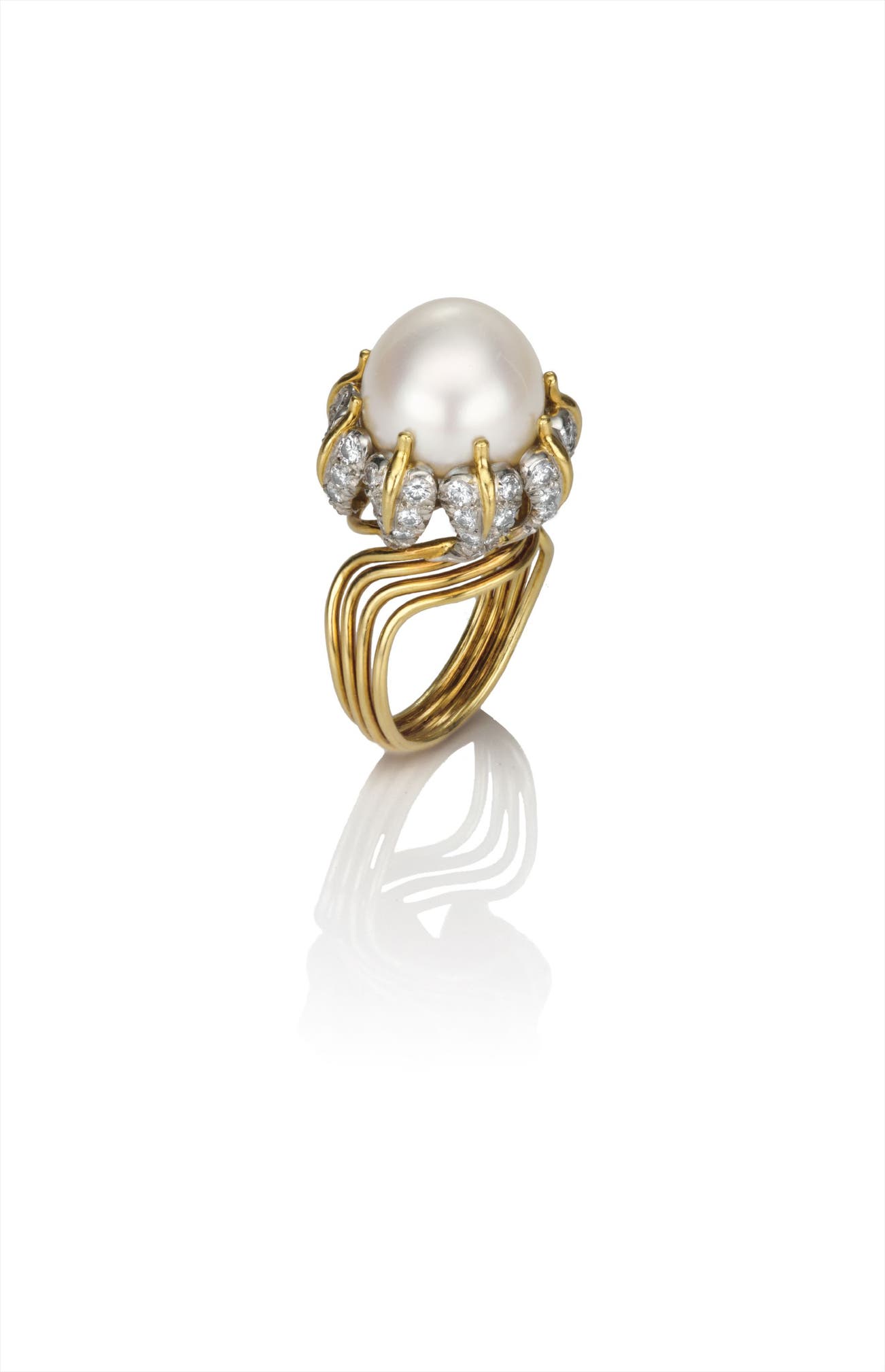 Centering upon a South Sea cultured pearl, measuring approximately 12.50 mm, set within a foliate bombé gallery enhanced by circular-cut diamonds and extending polished gold prongs, to the open wirework hoop, mounted in 18K yellow gold and platinum, size 5.