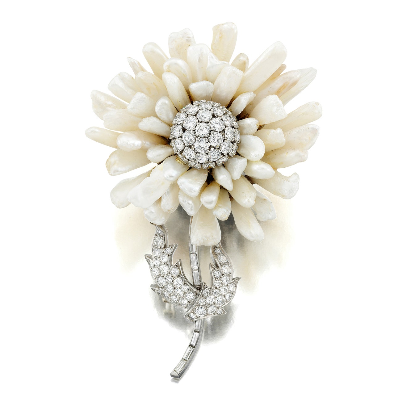 Of floral design, set with keshi pearls, accented by brilliant-cut and baguette diamonds, mounted in platinum, length approximately 3 1/4 inches, signed Schlumberger, with French assay marks and maker's mark for Pourrat.