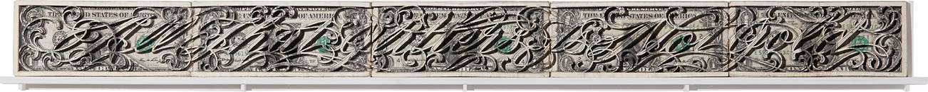 cut US currency, in 5 parts