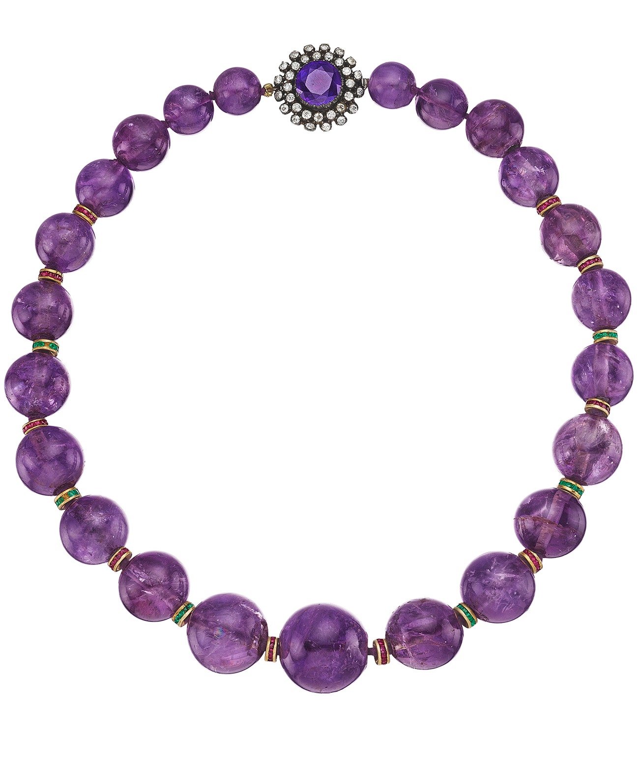 Set with amethyst beads, decorated with round rubies, emeralds and diamonds, mounted in 14K rhodium plated yellow gold, length measuring 18 inches, signed Seaman Schepps.