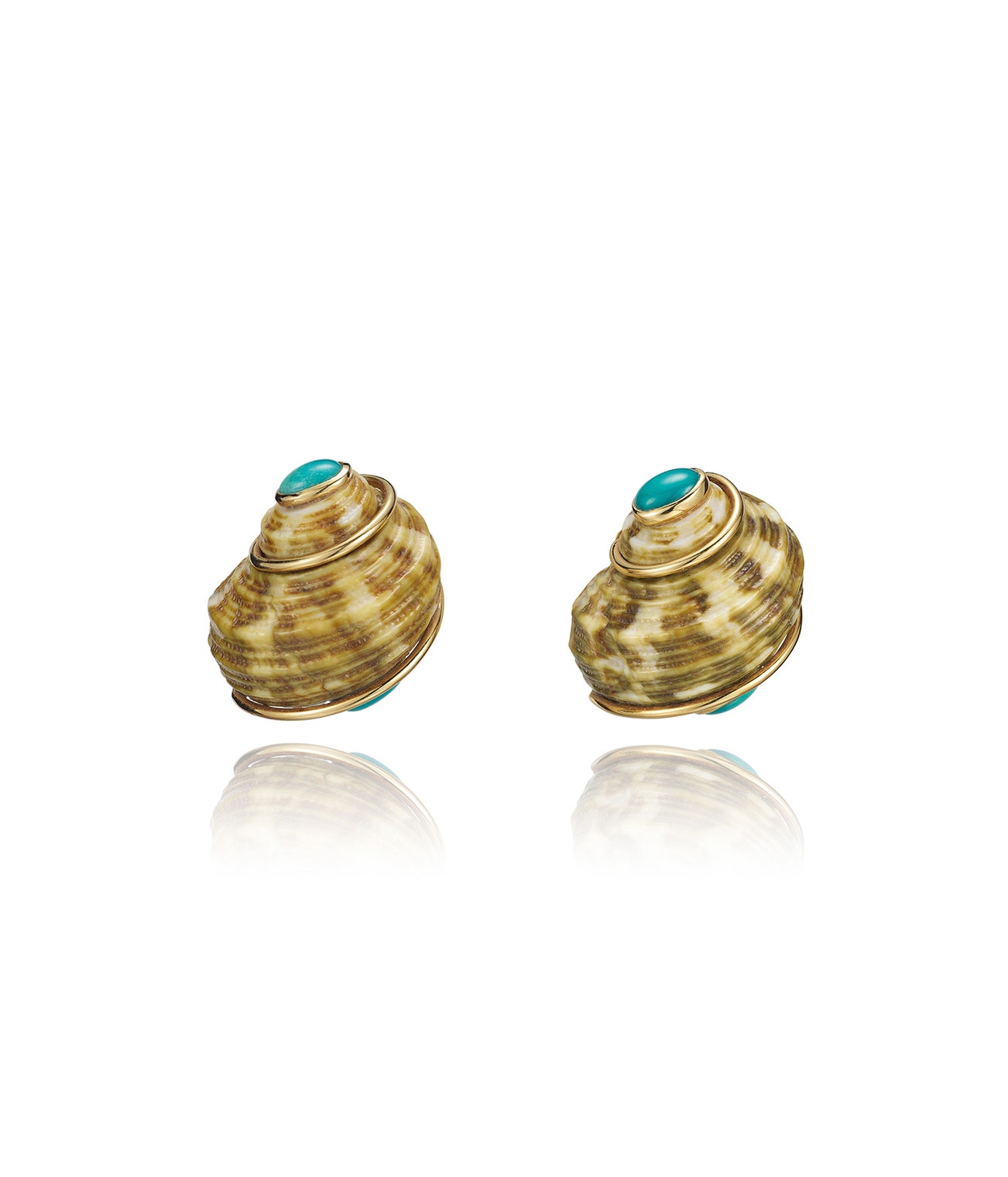 The turbo shells each embellished with oval cabochon turquoises, measuring approximately 23 x 25mm, signed Seaman Schepps, numbered.