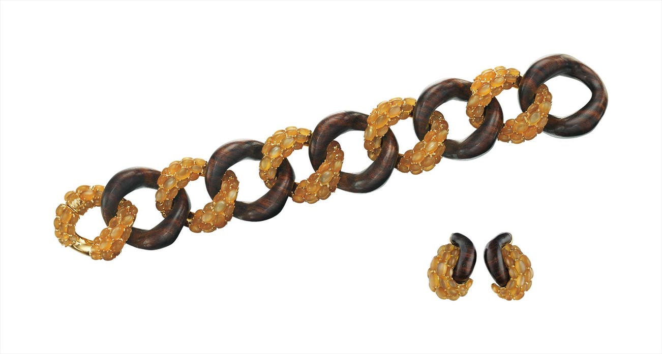 Comprising a bracelet, composed of a series of five wood curb links interlocking with five gold links, set entirely with oval-cut moonstones; a pair of earclips en suite, mounted in 18K yellow gold, bracelet length 8 1/4 inches, earclips length 1 1/8 inches.