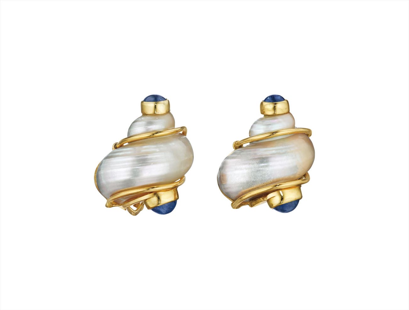Each designed as a sculpted shell, accented by polished gold ridges, to the cabochon sapphire terminals, mounted in 18K yellow gold, length 1 1/8 inches.