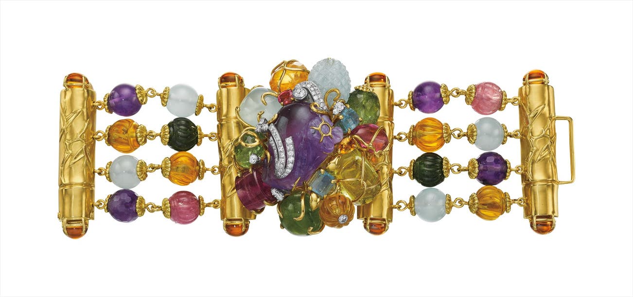 Centering on a carved multi-gem cluster, accented by circular-cut diamonds, extending four polished gold bombé links with cabochon citrine terminals, interspersed by four links composed of amethyst, aquamarine, citrine and tourmaline carved beads, mounted in 18K yellow gold, length 6 3/4 inches.