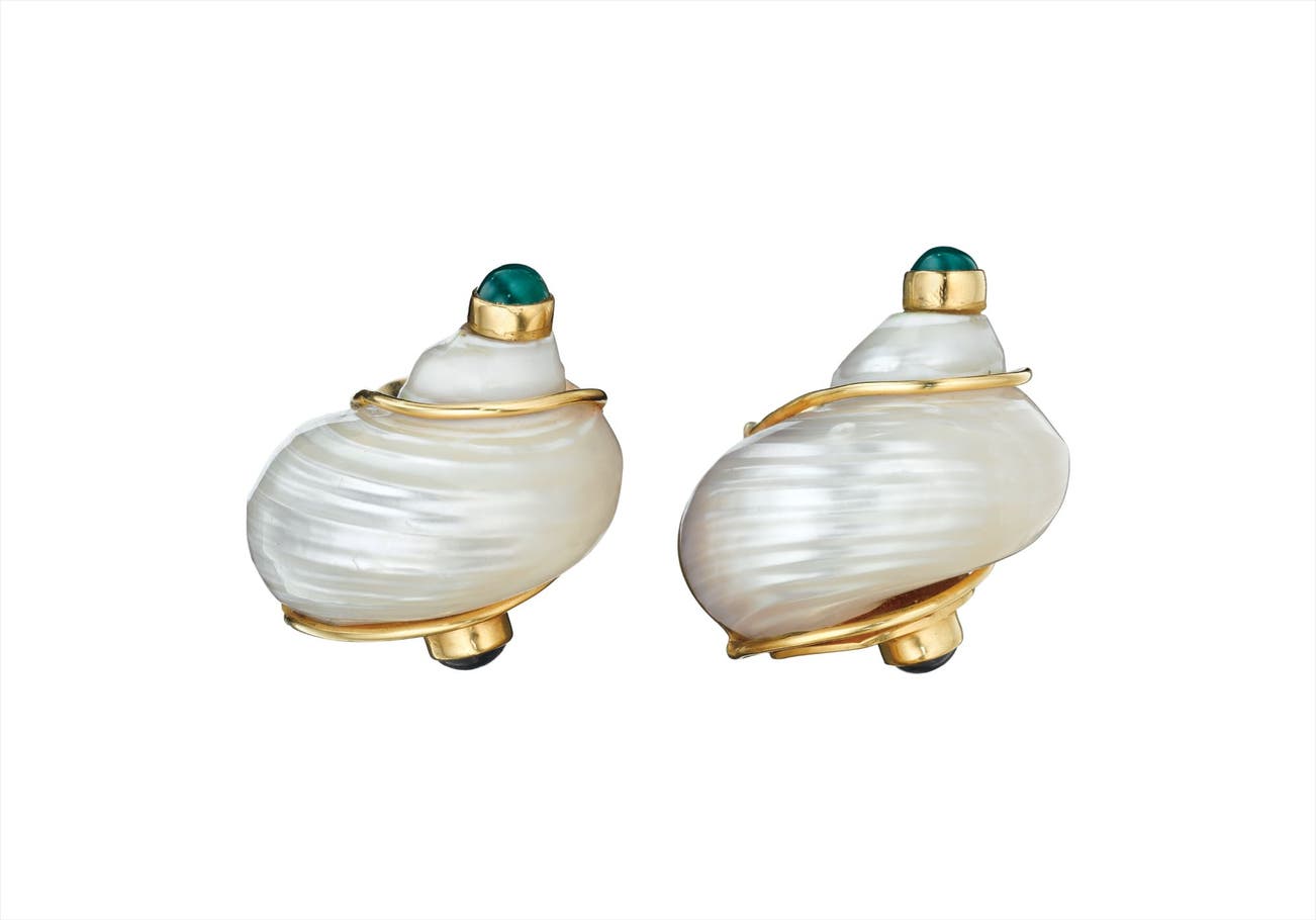 A Pair of Shell, Emerald, Sapphire, and Gold Earclips
