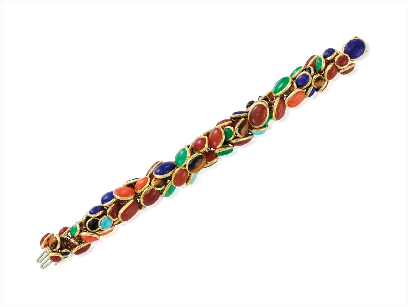 Designed as a cluster line of collet-set turquoise, coral, lapis lazuli, carnelian, chrysoprase, onyx, and tiger's eye, mounted in 18K yellow gold, length 8 1/4 inches.
