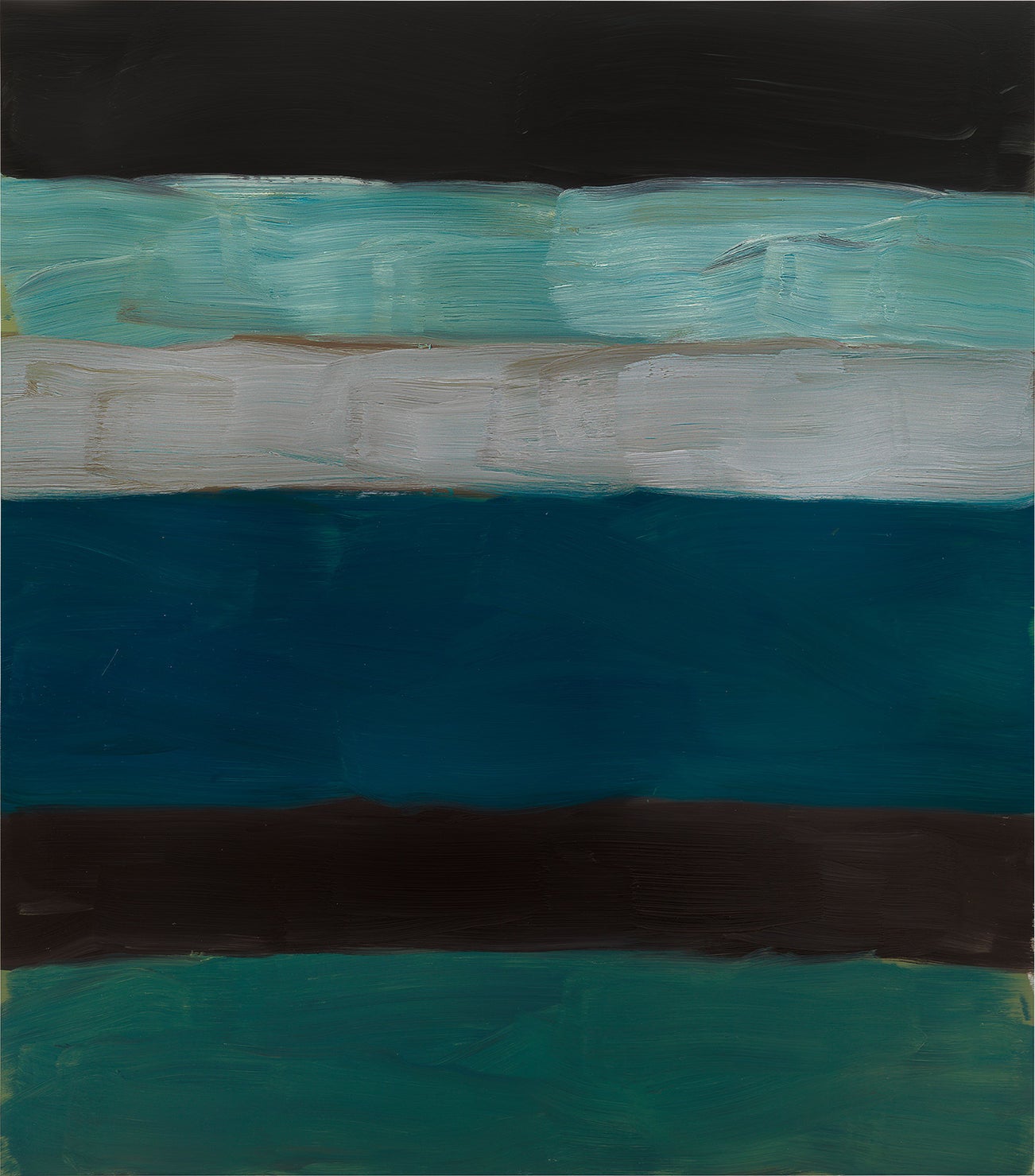 As the viewer’s eye moves from left to right across the surface of Landline Green Sea, the strokes of the artist’s hand across the surface creates a sense of movement that seems to hold the viewer in-situ - the horizontal lines recalling the horizon line between land and sea, the textured brushstrokes undulating like ripples in the water. While evoking the sublime Colour Field paintings of Mark Rothko, Landline Green Sea pays tribute to the long tradition of Venetian painting in the vein of Tintoretto’s luminism, Bellini’s tonalism and Titian’s chromatic materiality – all the while insisting on the conceptual potential of non-representational use of colour.