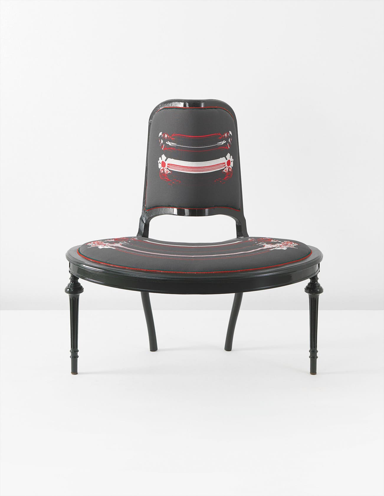 Silk-embroidered fabric, painted wood.