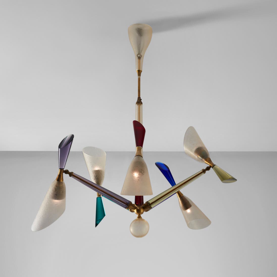 A drawing of the two-armed version of the present model ceiling light is included in the Archivio del Centro Studi del Vetro under inventory number AVSEG-D141-030.