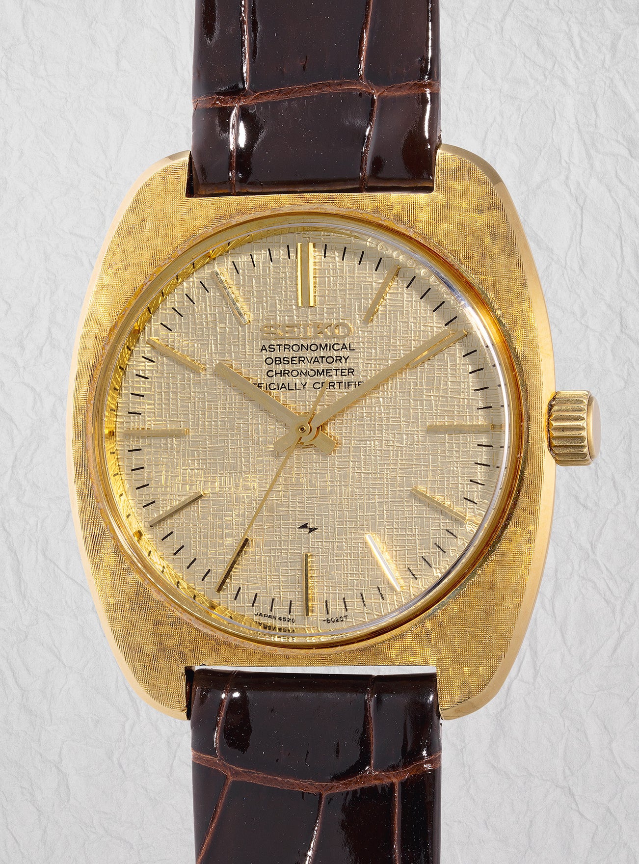 Selling for 180,000 Yen in 1969, the Astronomical Observatory Chronometers were priced about six times higher than the basic Grand Seiko at the time. The case features a beautiful and delicate linen finish, mirrored by the dial. While the calibre 4580 was fitted in the 1969 and 1970 watches, all were labeled “4520” on the dial at six o’clock. Notably, this particular wristwatch was equipped with a display back, allowing admiration of the incredible chronometer movement, whereas the original case back was solid. What is even more impressive is that the present watch was also included in The Seiko Museum from June to August 2014 after servicing.