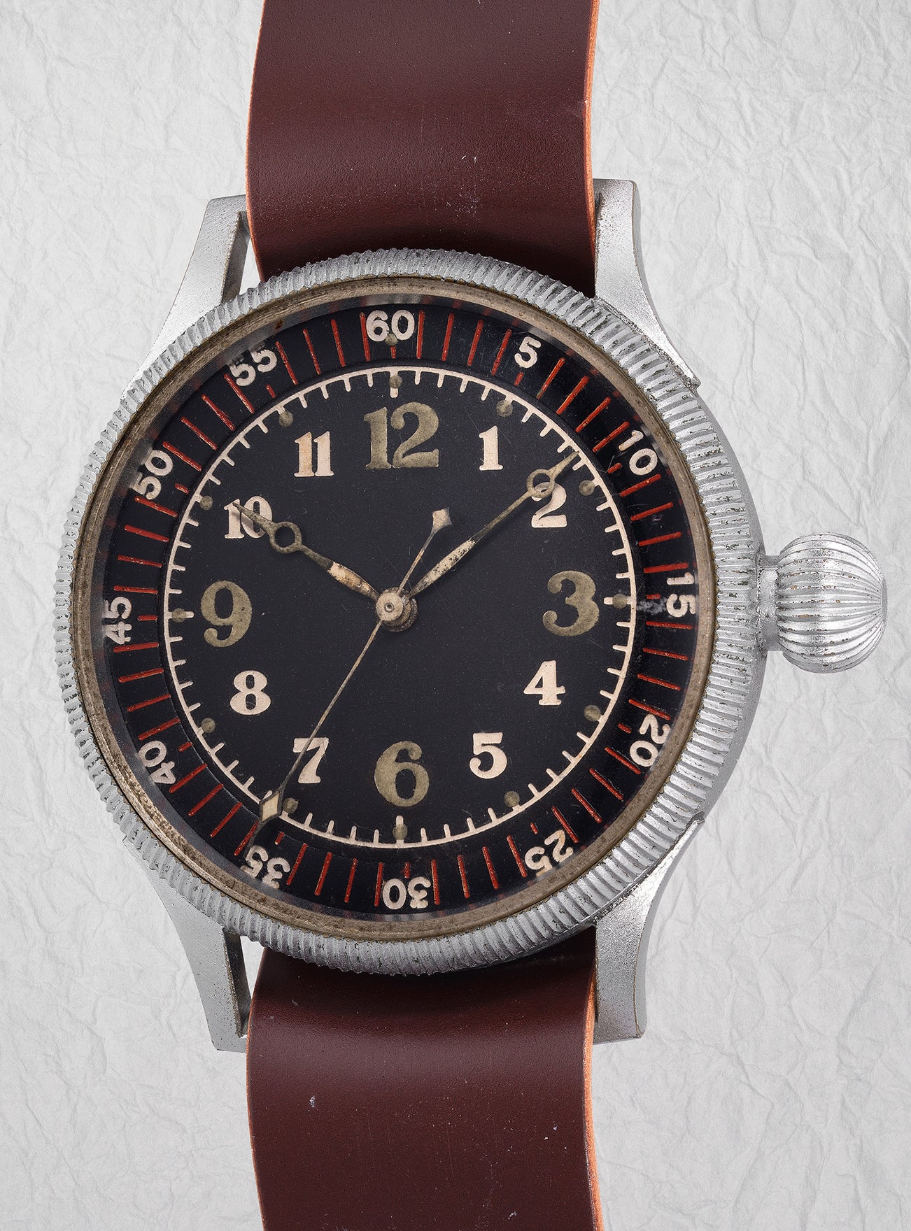 A historically intriguing nickel-plated pilot’s wristwatch with revolving bezel