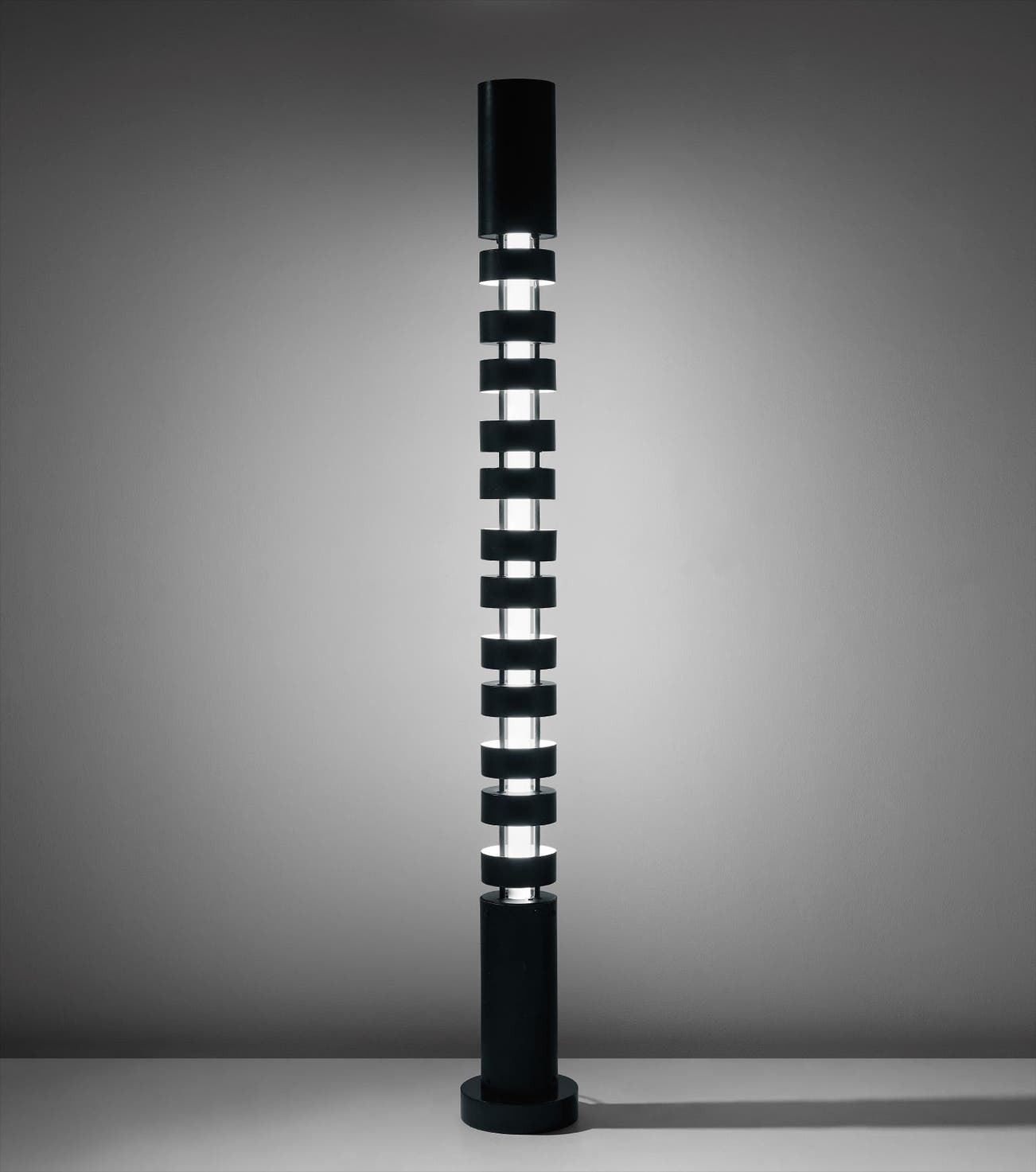 The 'Totem' standard lamp belongs to the ‘Colonnes’ (Columns) collection launched in 1961 by the recently founded S.C.M. (Société de Création de Modèles) and presented in 1962 at the Salon des Arts Ménagers. With this series Mouille aimed to accomplish a radical stylistic break with his previous career, dominated by the well-known ‘Black Forms’. Contrarily to his former creations, ‘Colonnes’ displays the rigid geometry of the urban and architectonic aesthetics of the 1960s and includes new industrial materials such as the fluorescent tube.