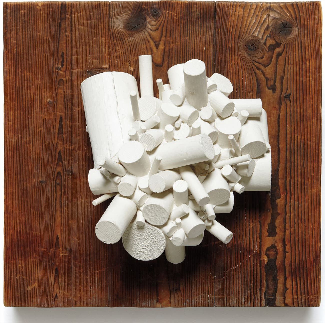 Composed of variegated cylindrical elements pulsating from a dense and organic core, Relief Rayonant is a fascinating departure from Camargo’s monochrome reliefs. Here, an irregular, amorphous yet monochrome structure swells from the artist’s chosen plinth – a simple unpainted wooden plank – resulting in a visceral composition that transcends the boundaries of painting and sculpture. Curved, cylindrical surfaces combine in geometric though vigorous form – atomic elements comprising the organic whole. “The subtle restlessness of regularity absorbs us, but at times elements are also disorderly grouped – agglomerated, convulsed, dramatic, agony of space – and long to escape from the surface, expelled from plane and beyond the place.” (P. Filho, “clear enigma,” in Sergio Camargo: claro enigma, exhibition catalogue, Instituto de Arte Contemporânea, São Paulo, pp. 72-73)