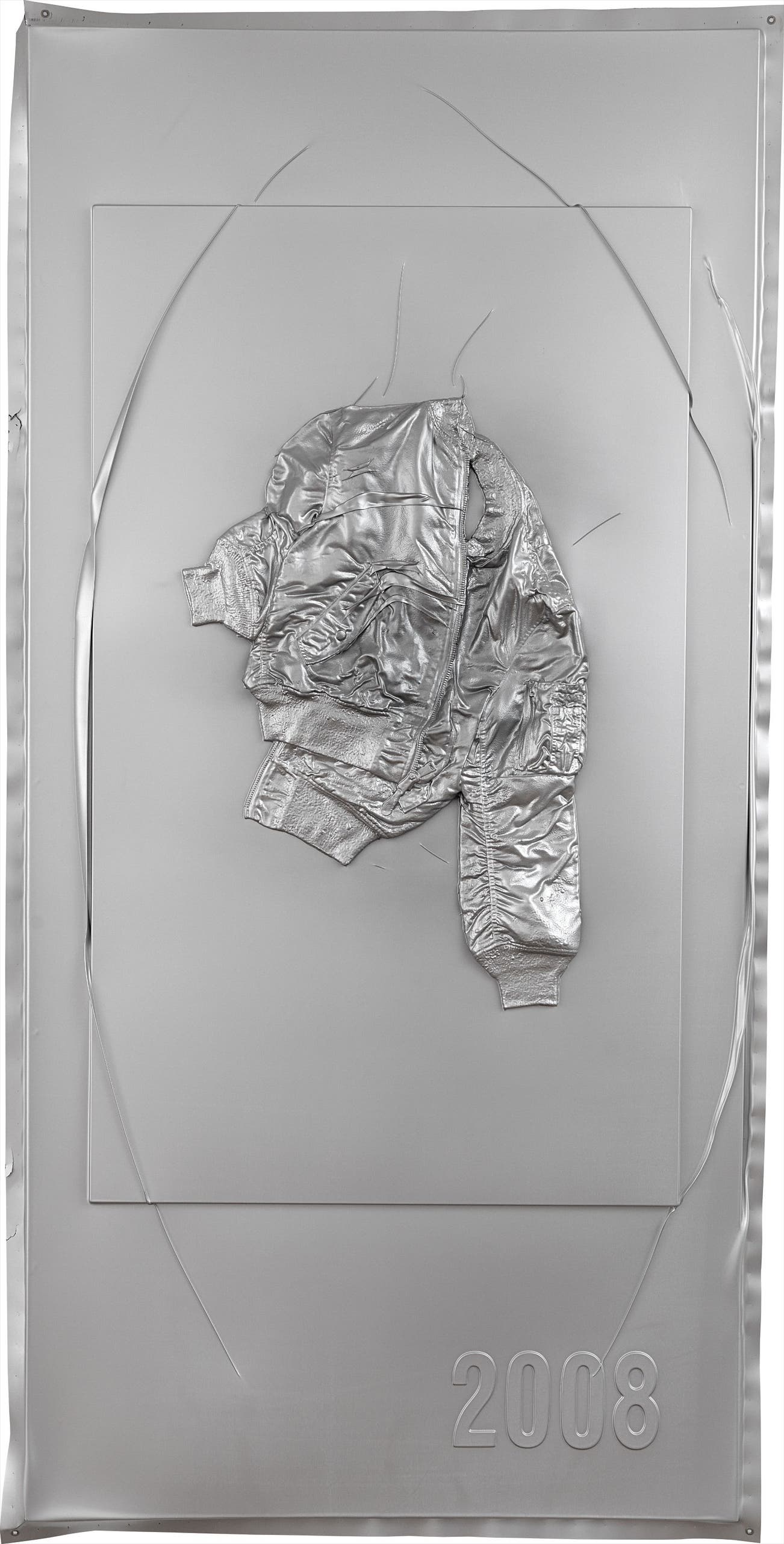 Seth Price is truly one of the leading artist’s of the contemporary avant-garde. The artist has continually produced an oeuvre of work that destabilizes the mechanics of both ideologies and modes of consumption. Throughout a body of work that includes paintings, video, sculpture and scholarly writing the artist has constantly and eloquently questioned how the things we purchase and what we feel they mean about us construct and condition our conceptions of self and the world around us. While a clear and worthy descendent of artists from both the conceptual and pictures generation—not to mention dada, surrealism, and the Situationsists—Price none-the less has found a new language and set of tools to tackle long-standing concerns. Price often uses bootlegged or pirated materials culled from the Internet in order to explore how value is created and where it is placed. Vintage Bomber is created through the process of vacuum-forming this iconic style of jacket in high impact polystyrene, which is then painted with acrylic and enamel – here in a luminescent silver. The process involves melting a form of hot plastic around a solid object and then allowing it to cool into a rigid mass while vacuum pressure is applied to create a single form or a reusable mold. The plastic shell covering the jacket becomes a central aspect of the piece, taking the form of the object encased within while and acting almost like commercial packaging. The series is the most highly-sought after by the artist and this example is made further exceptional by the glinting metallic silver color – it virtually vibrates with power and mystique while maintaining a weighty patina of downtown cool and style.