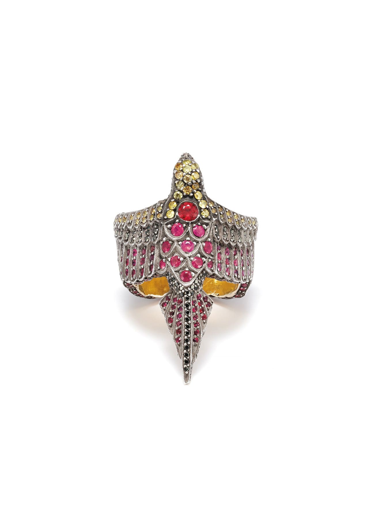 A Colored Diamond, Diamond, Ruby, Gold and Silver Ring
