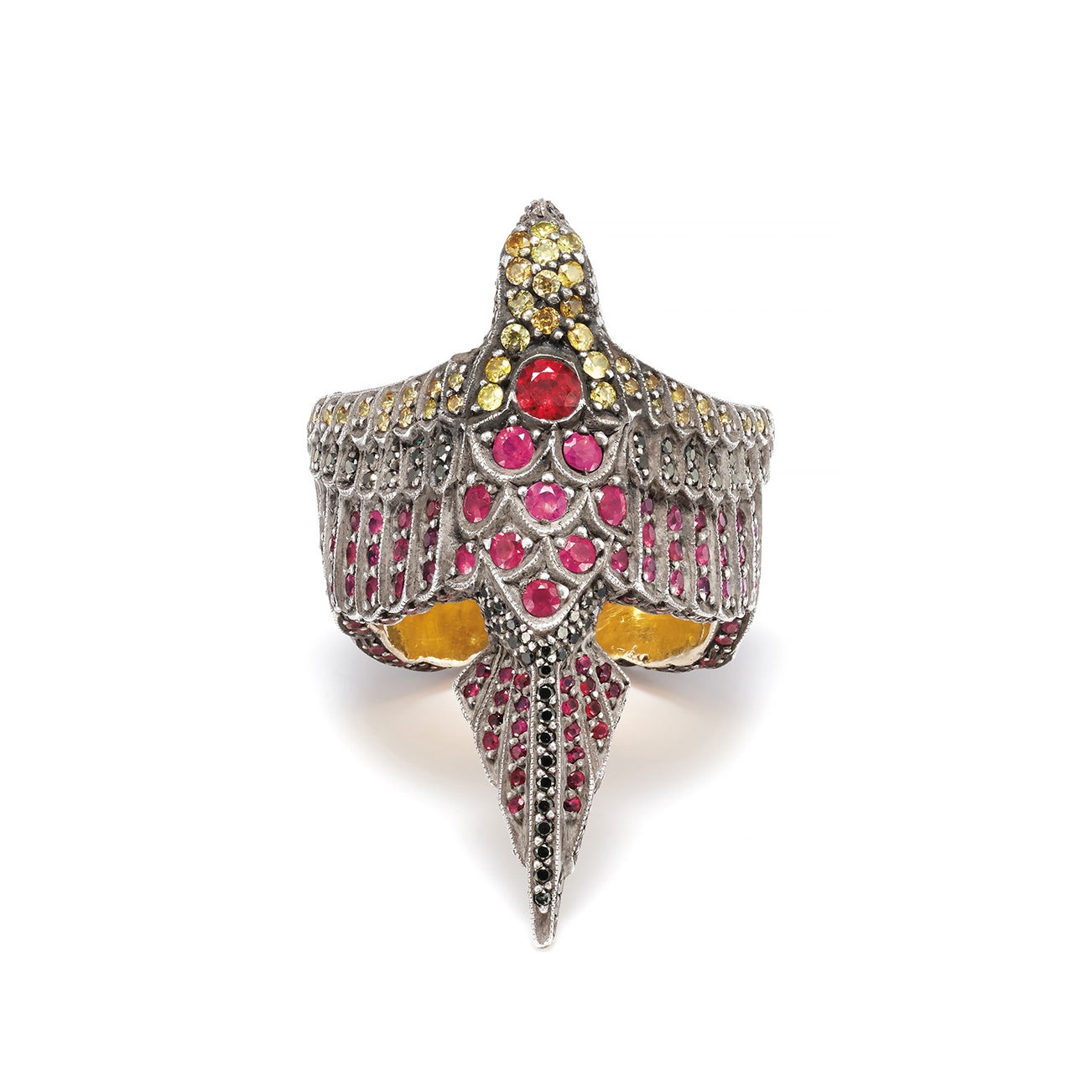 A Colored Diamond, Diamond, Ruby, Gold, and Silver Ring