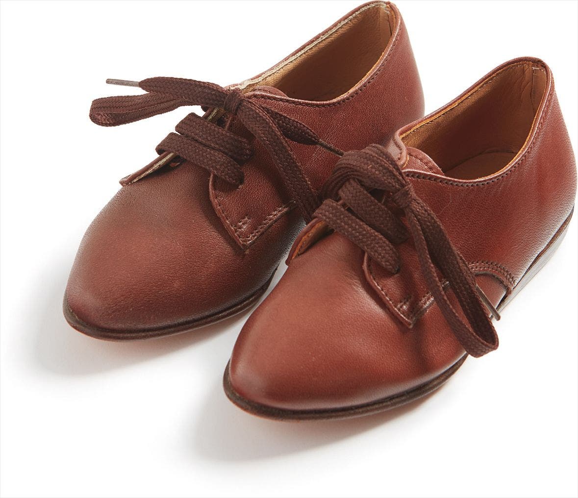 Children’s leather shoes with cloth shoe laces.
