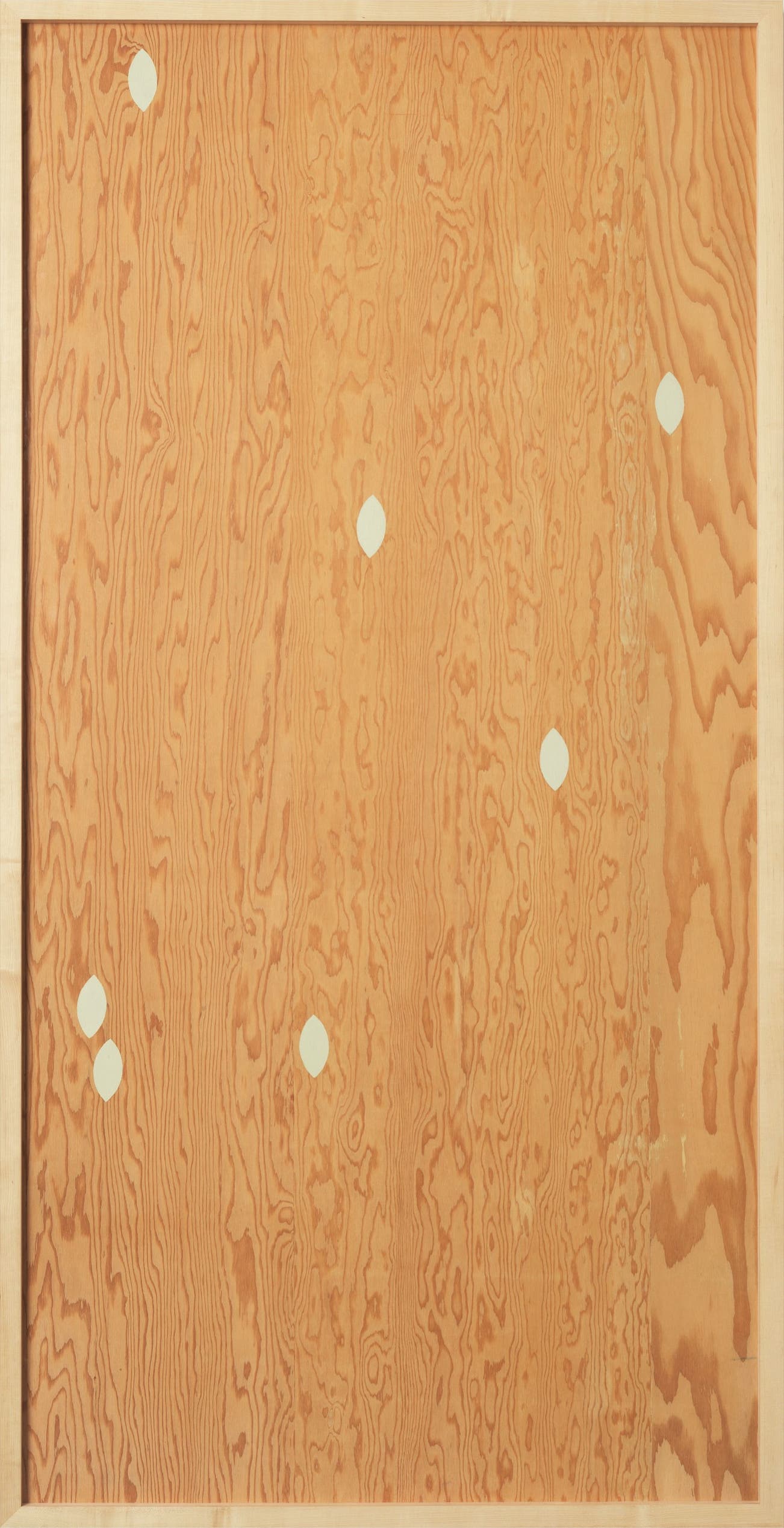 Through Levine’s iconic treatment, a prosaic piece of plywood panel is transformed into a gilded icon. In these Parchment Knot series, the missing natural knots of the wood grain are filled with aureate ovoids in scattered places throughout. While the placement is arbitrary, the ovoids cascade across the grain like raindrops, with a single knot in the top left corner, a second and a third in the center, and fourth and fifth in the final register. With this deluge of golden drops, one can imagine that beneath the picture plane lies a gilded and shimmering pool of pigment. The knots in the natural wood panel are of course a byproduct of nature itself; but here, they have been solidified by the artist’s Midas touch, forever captured in their wooden frames. With this minimal and subtle gesture, Levine has reimagined the impassive and steadfast medium as a canvas with infinite possibilities.