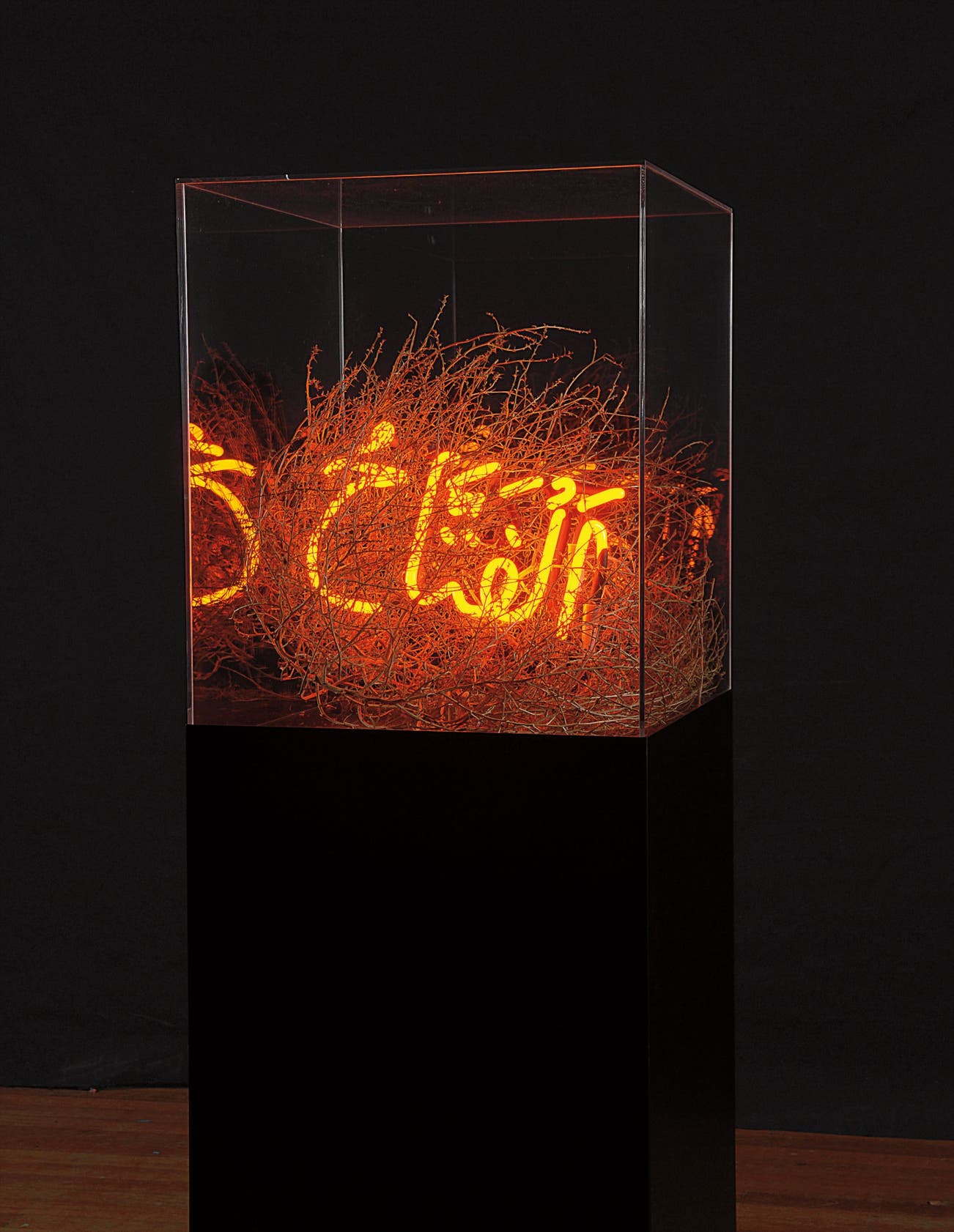 neon, tumbleweed, artist's acrylic glass and enamelled aluminium plinth