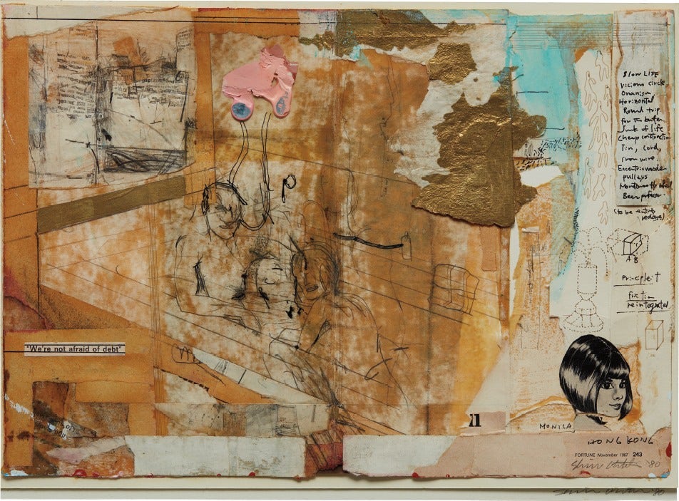 Numerous exemplary works by Shinro Ohtake, one of Japan’s leading and most innovative contemporary artists, are featured in Katayama’s collection, including Hong Kong (1980) which reflects Ohtake’s signature mastery of collage. The world serves as Ohtake’s primary inspiration, manifested in layered representations of visions, dreams, and journeys expressed in his multimedia practice that extends into drawing, painting, large-scale assemblage and architectural pieces amongst other media. Ohtake’s renowned series of Scrapbooks, unique sculptural books comprised of found imagery and materials begun in 1977, were exhibited at the Venice Biennale in 2013.