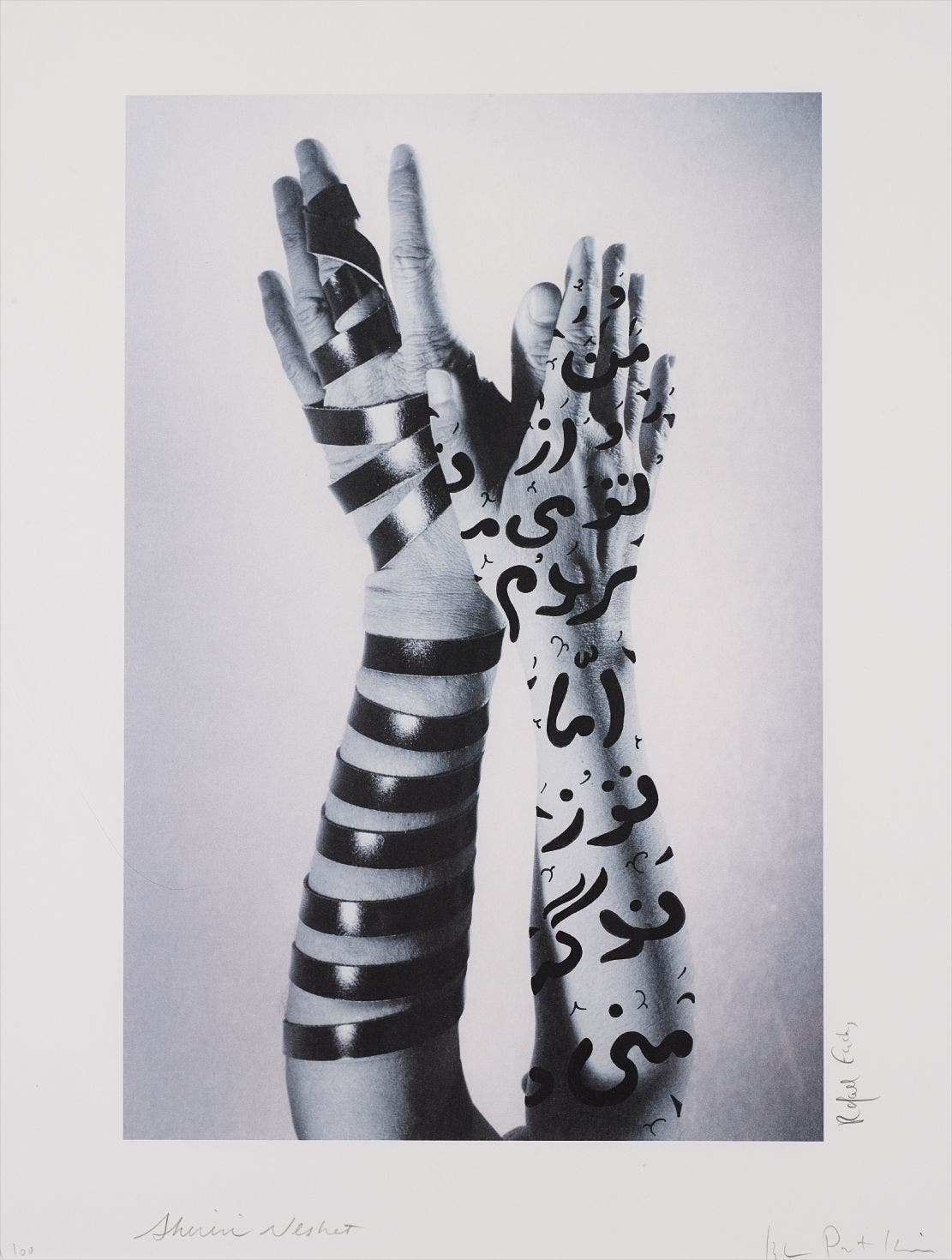 Signed and numbered "49/100 Shirin Neshat" lower edge; further signed "Izhar Patkin Rafael Fuchs" by the photographer's collaborators along the lower edge. This work is number 49 from an edition of 100.