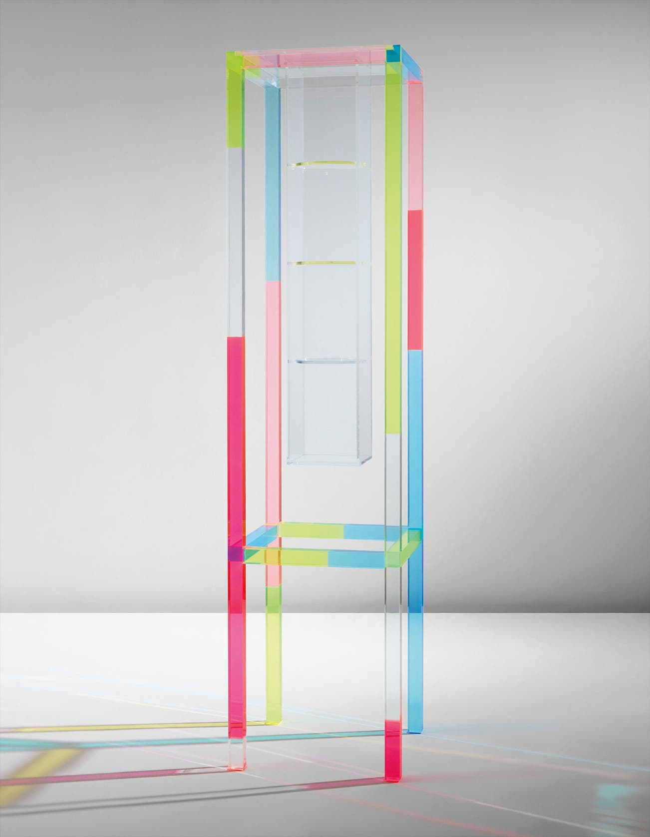 The "Cabinet de Curiosité" was among a group of colored acrylic furniture and objects exhibited at Galerie Yves Gastou in Paris during the late 1980s. It is one of Shiro Kuramata’s many explorations into concepts of color and transparency that culminated in his late-career use of acrylic. These designs invite unlimited visual contemplation, testing spatial and temporal boundaries as they contort color, line, and form. This effect is achieved through a number of optical contrasts: the borders are simultaneously discrete and interactive, the minimal physical footprint is disputed by the broad expanse of colored light reflected onto the cabinet’s surroundings. The name itself, "Cabinet de Curiosité," poses a comprehensive challenge as it evokes a repository of tangible historic objects rather than the acute sense of negative space suggested by its actual material presence. This cognitive contrast of historicism versus timelessness was a post-modernist tool often employed by Kuramata and revealed with subtle mastery in the present lot.