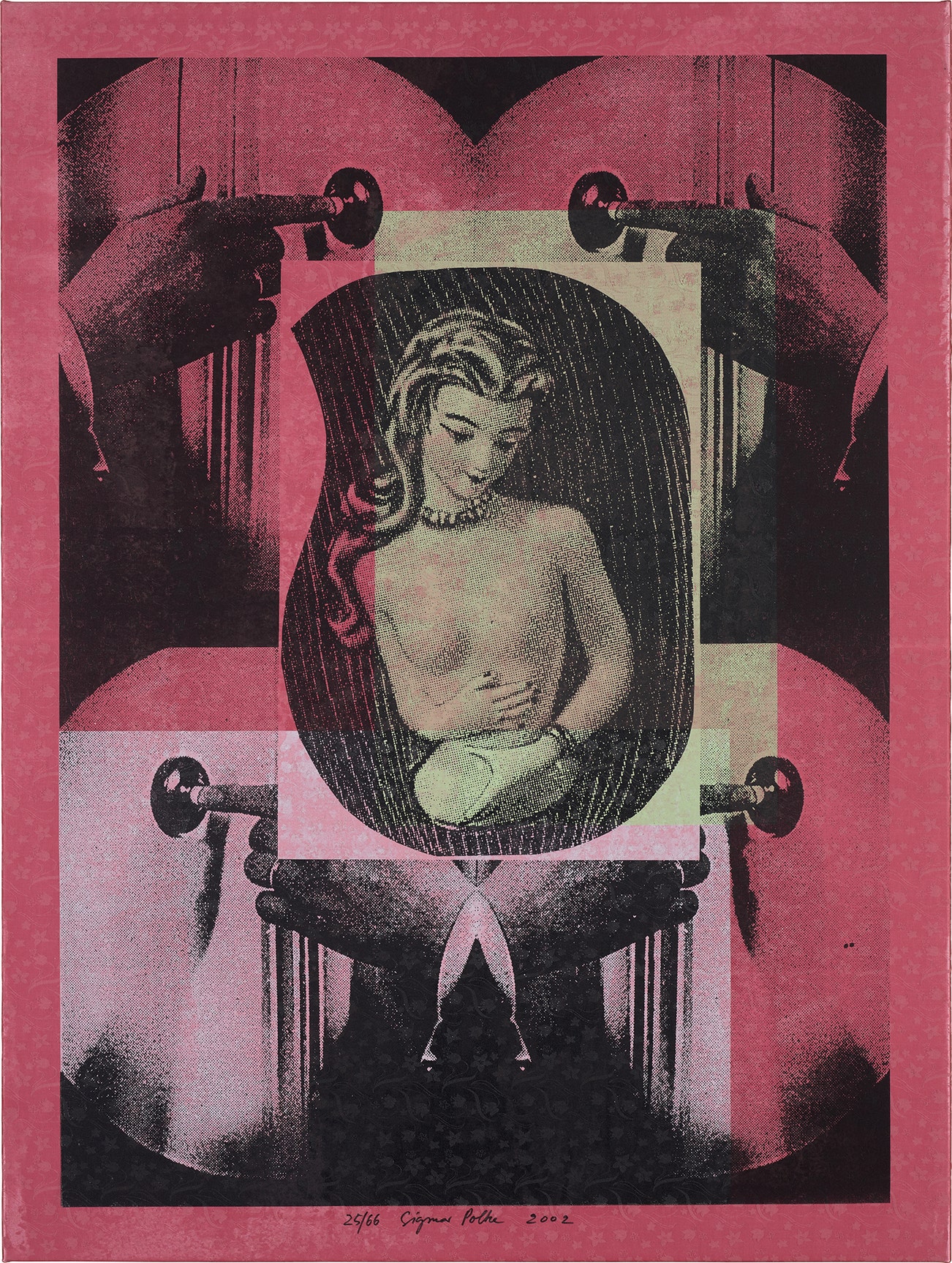 Signed and numbered 25/66 in black felt-tip pen (one of 66 unique variants on varying fabrics, there were also some artist's proofs), published by Mike Karstens Graphics, Münster (with their inkstamp on the reverse of the stretcher bars), framed.
