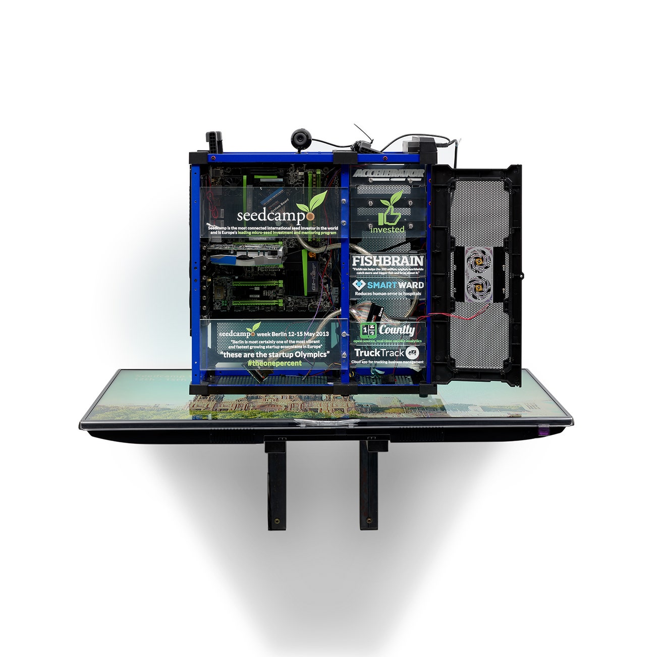 Antec Lanboy customizable PC case, digital print on Plexiglas, various customizable PC parts, metal fittings, Samsung 40" LED 3D Smart TV, editioned promotional video collaboration with Marco Woldt and USB stick