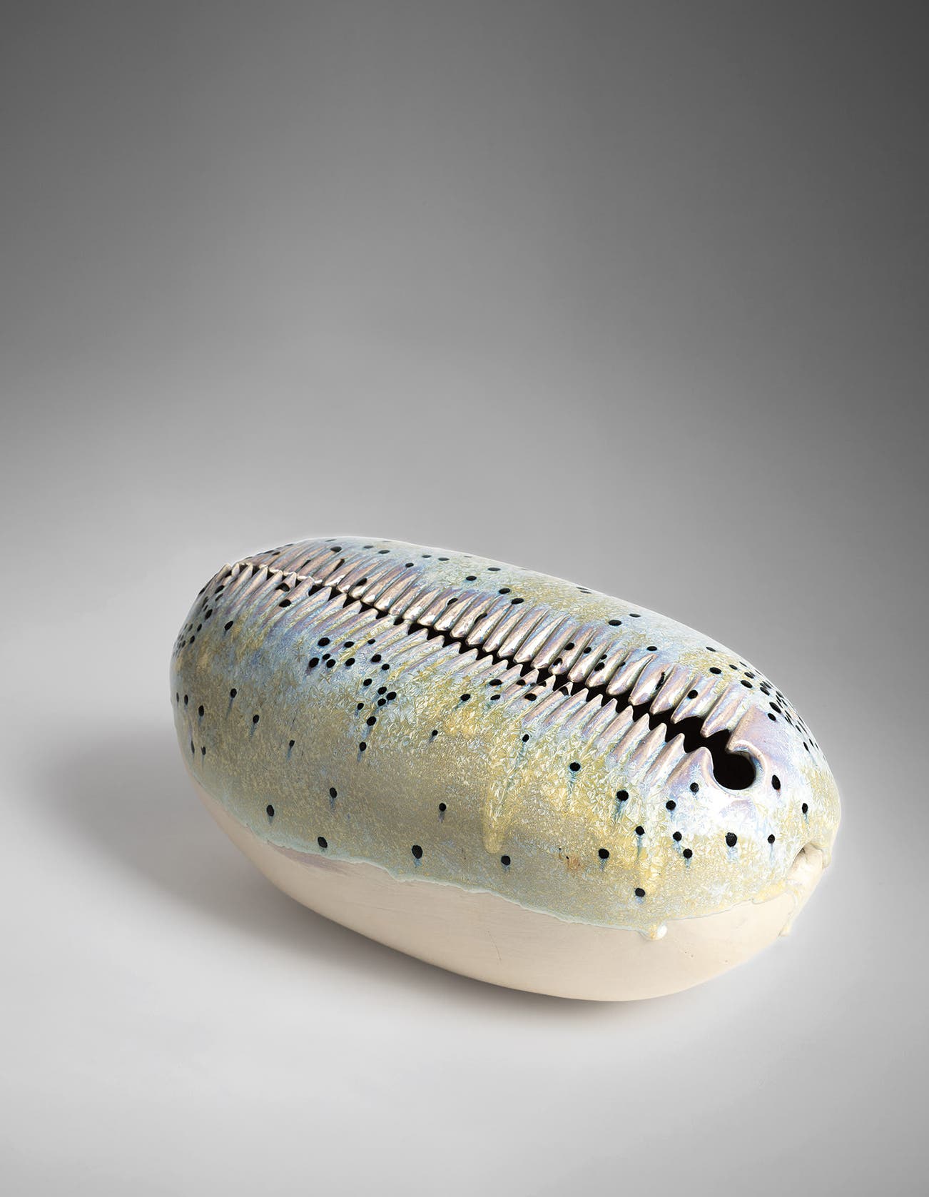 Employing ancient African pottery techniques to create works that are profoundly contemporary, the present work is a refined example of Leigh’s technical dexterity. Reflecting on her ceramic practice, the artist notes ‘Most of the cowries I made are porcelain and are fired in a salt kiln - an atmospheric firing with common salt thrown into the kiln at peak temperature…The salt bonds with the silica in the clay body to form a glaze whose texture is reminiscent of orange peel, which provides lots of unpredictable effects’ (Simone Leigh, quoted in Elizabeth Kley, ‘MOUTHING OFF’, artnet, online).