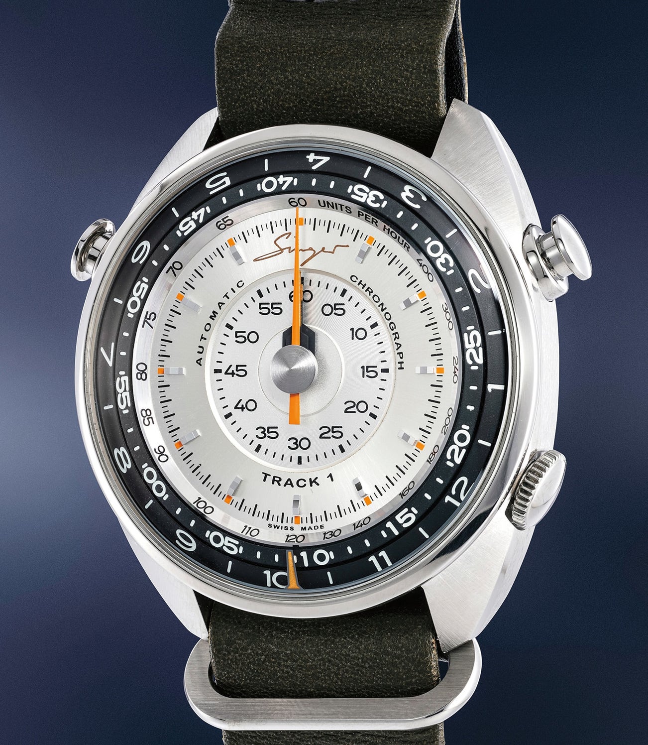 The result is the Track 1 Launch Edition of which the present example is the original prototype. This piece of horological mastery definitely has the look and feel of a fuel injected high velocity machinery. The case is unabashedly 1970s in design and the dial looks like a speedometer on a 911 dashboard with two centrally mounted orange hands. These hands are in fact the chronograph counters, the large hand being the seconds counter and the smaller one the minutes counter. Time is read via two rotating aluminum discs that rotate clockwise indicating hours and minutes via an orange marker at 6 o’clock.