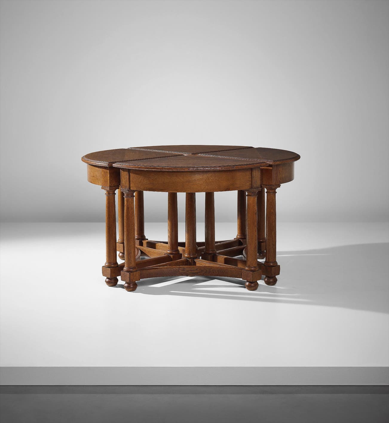 The present model bears all the hallmarks of Sir Edward Lutyens' furniture design: the legs, typically Tuscan columns sitting atop a curved stretcher rail with turned bun feet, are instantly recognisable as his design. Lutyens showed a marked interest in modular and flexible pieces that could be moved around and fitted together. The quadrant form of this table is an early example of this enthusiasm. The present lot is comparable to the table designed for the Walnut Dining Room of Marshcourt, built in 1901-1904, which is considered to be one of Lutyens’ most revolutionary houses, both in its style and materials.