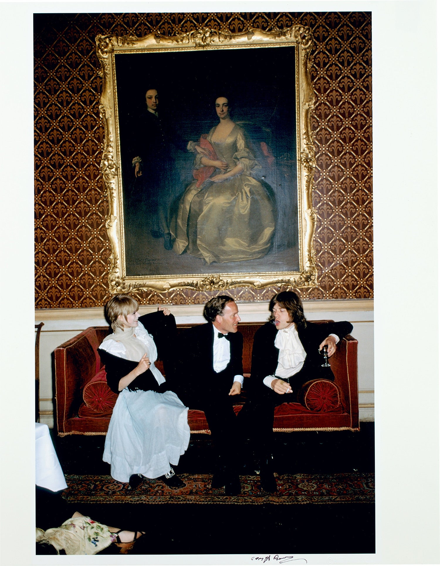 “I was in Ireland on a story and the four of us went from Desmond Guinness’s castle to Castletown Mansion where a big party was being given. I saw this painting in the hall, and began to pose them for a shot. Within a few minutes a local Irish press camera crew gathered around and began shooting the shot the way I had it set up. We all shot it.” Slim Aarons speaking on the present lot: Marianne Faithfull, the Honorable Desmond Guinness, and Mick Jagger at Castletown Mansion, Ireland, 1968